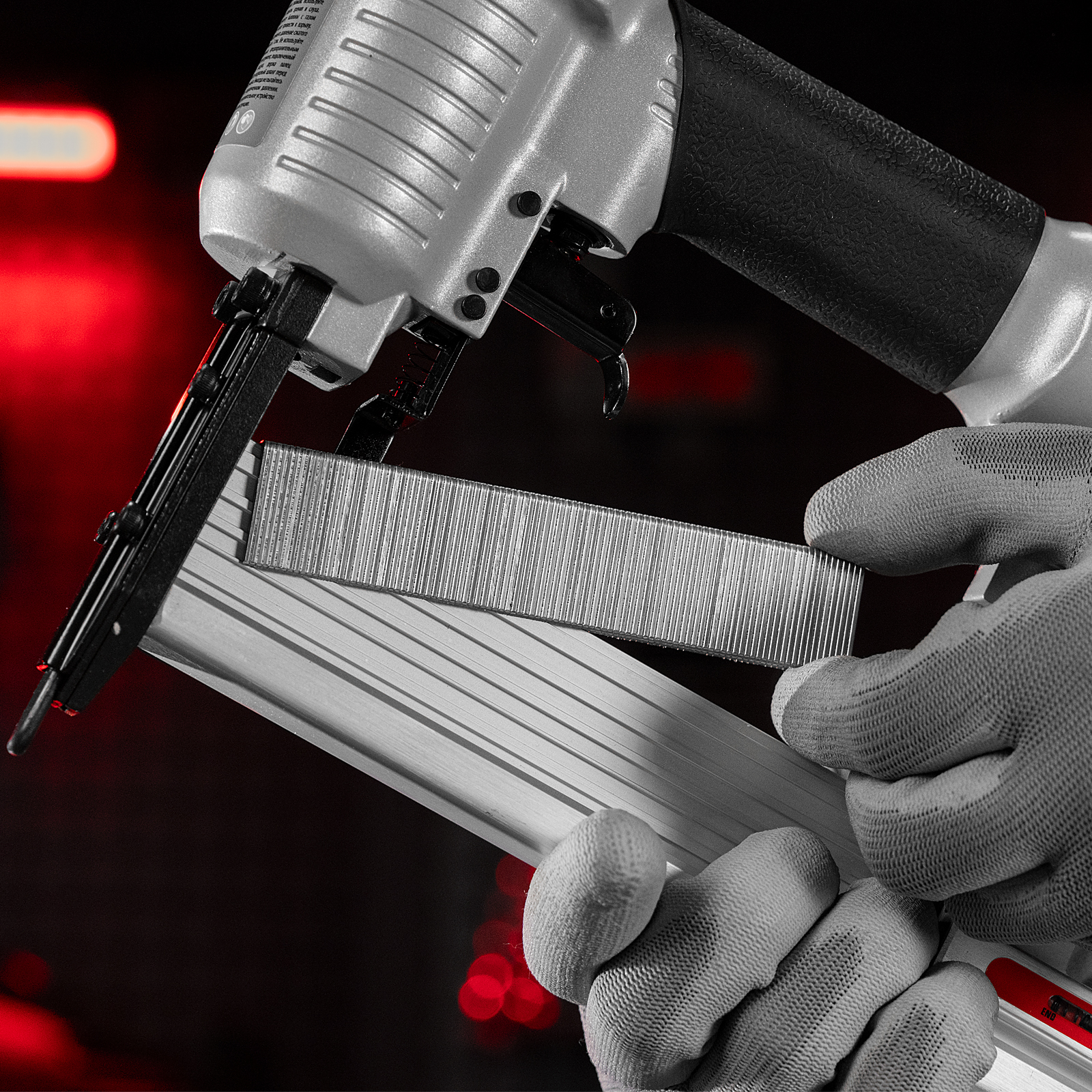 в упаковке, устанавливаются в пневматический степлер, совместимый с крепежами сечением 1,25 х 1,0 мм, шириной 5,7 и длиной 25 мм.