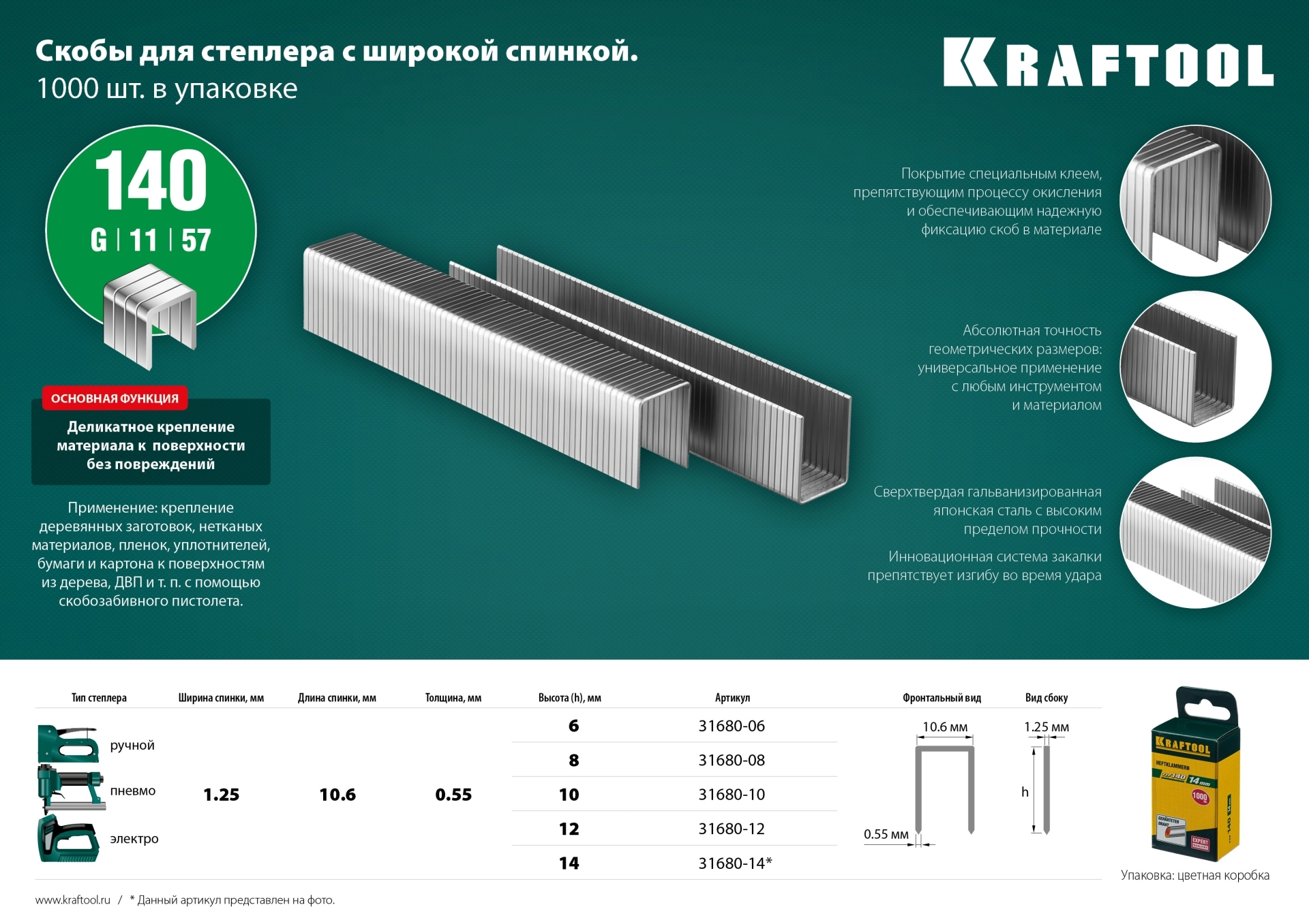 ПроизводителиСкобы для степлера плоские тип 140, 12 мм, 1000 шт. (31680-12) KRAFTOOL