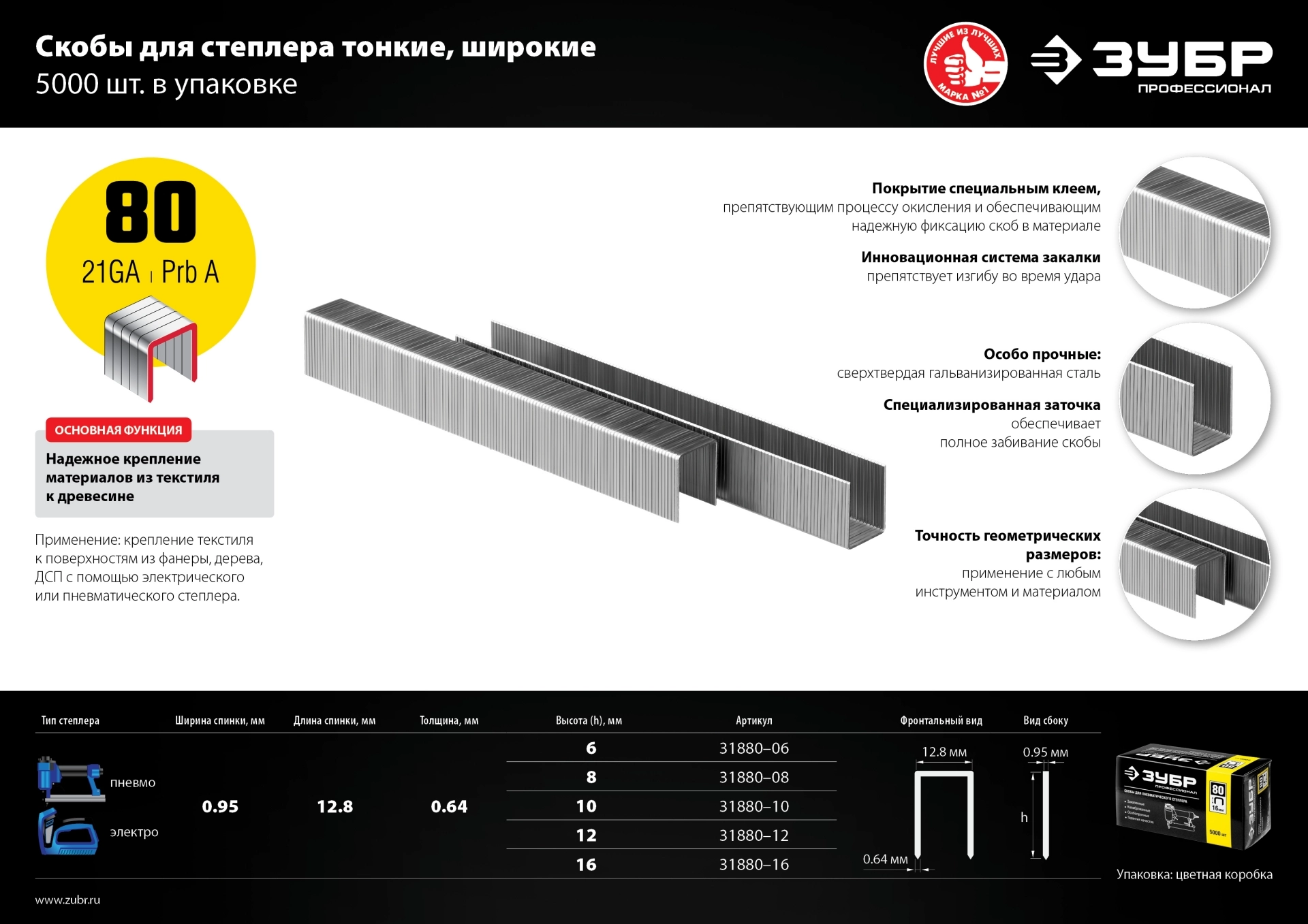 ПроизводителиСкобы для степлера тонкие тип 80, 10 мм, широкие , 5000 шт. (31880-10) ЗУБР