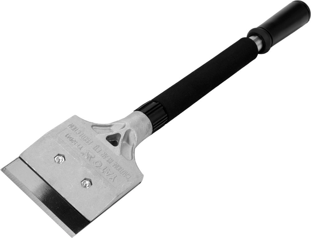 Скребок для пола, тяжелая конструкция, ручка для отбивания из стальной трубки, покрытой губкой. Головка - литой алюминий, лезвие из стали 65мн прочно закреплено двумя винтами. Общая длина 500 мм, ширина лезвия -100 мм толщина 1,5 мм / лезвие вращается, затачивается с двух сторон, что значительно продлевает срок службы инструмента. Сменные лезвия доступны YT-52843.