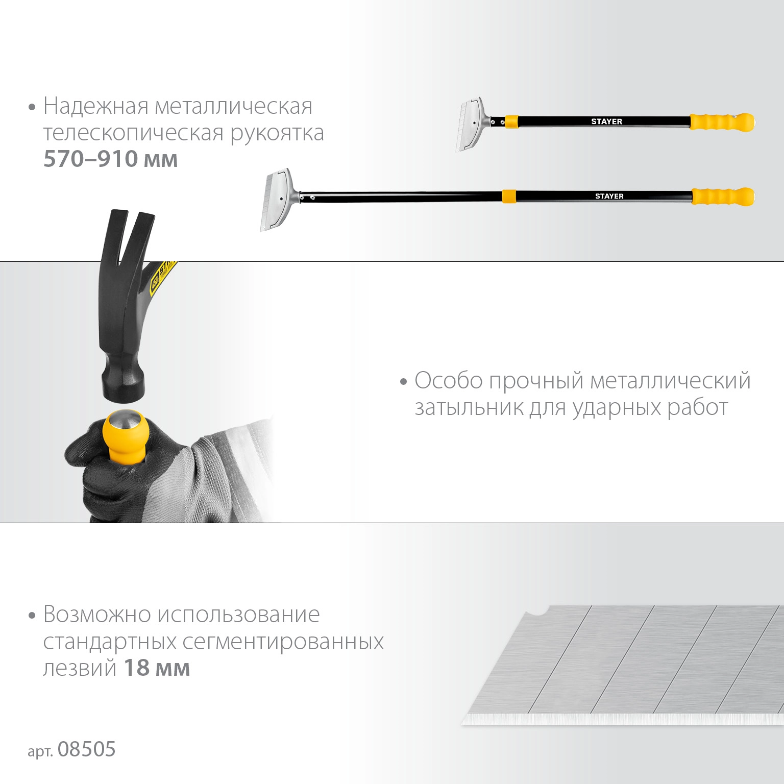 ПроизводителиСкребок телескопический универсальный, 570-910мм, лезвие 100мм (08505_z02) STAYER