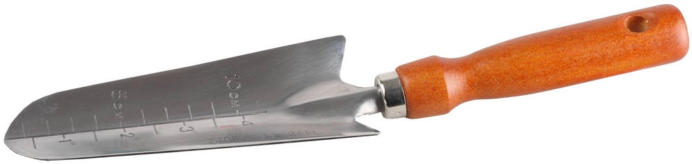 Ручной садово-огородный инструмент из нержавеющей стали с деревянной ручкой создан специально для качественной и неутомительной обработки почвы. Рабочая часть всех инструментов выполнена из высококачественной стали, не подверженной коррозии. Рукоятки эргономичной формы изготовлены из дерева твердых пород, отполированы, покрыты лаком и имеют удобное отверстие для подвеса. Применяется для посадки растений в саду и огороде.
