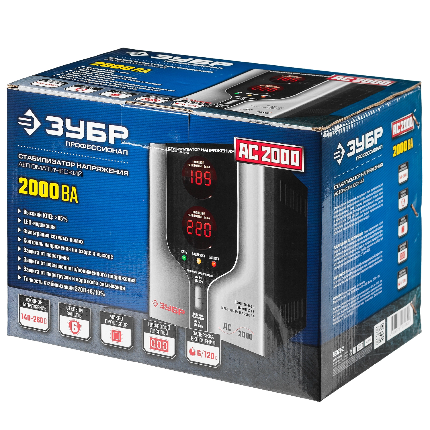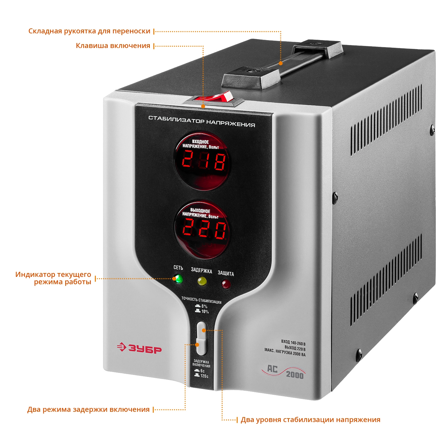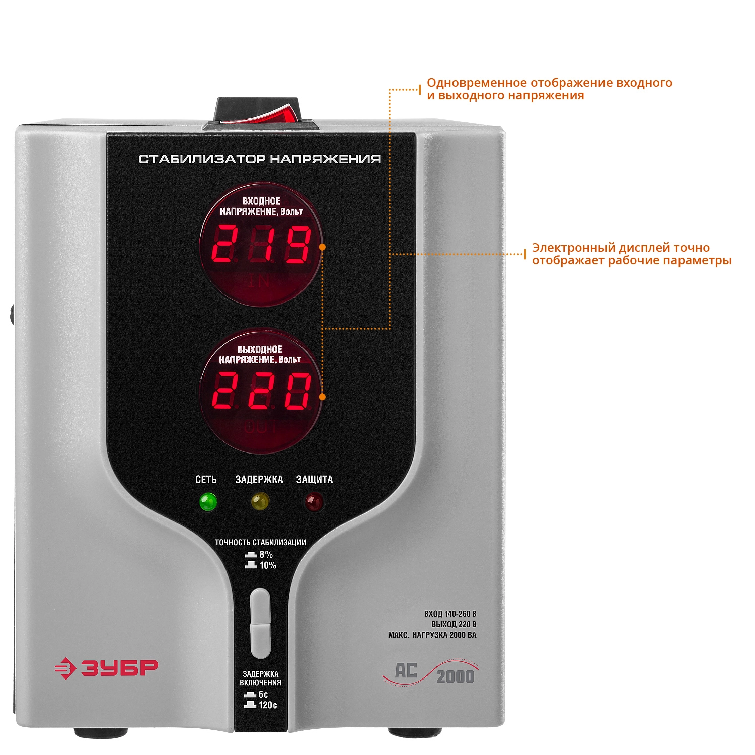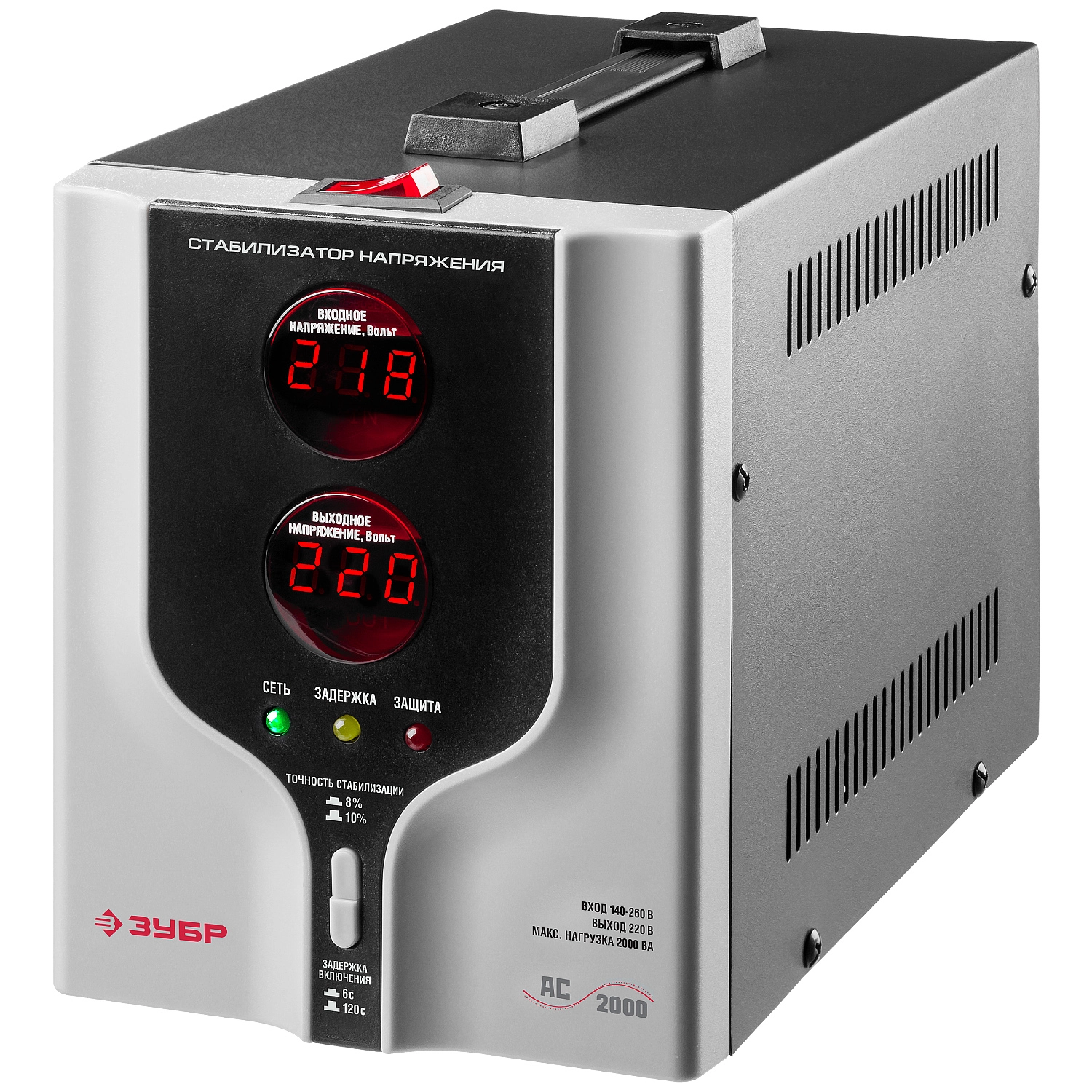 ПроизводителиСтабилизатор напряжения АС 2000 (2000 ВА, 140-260В, 8%)(59375-2) ЗУБР