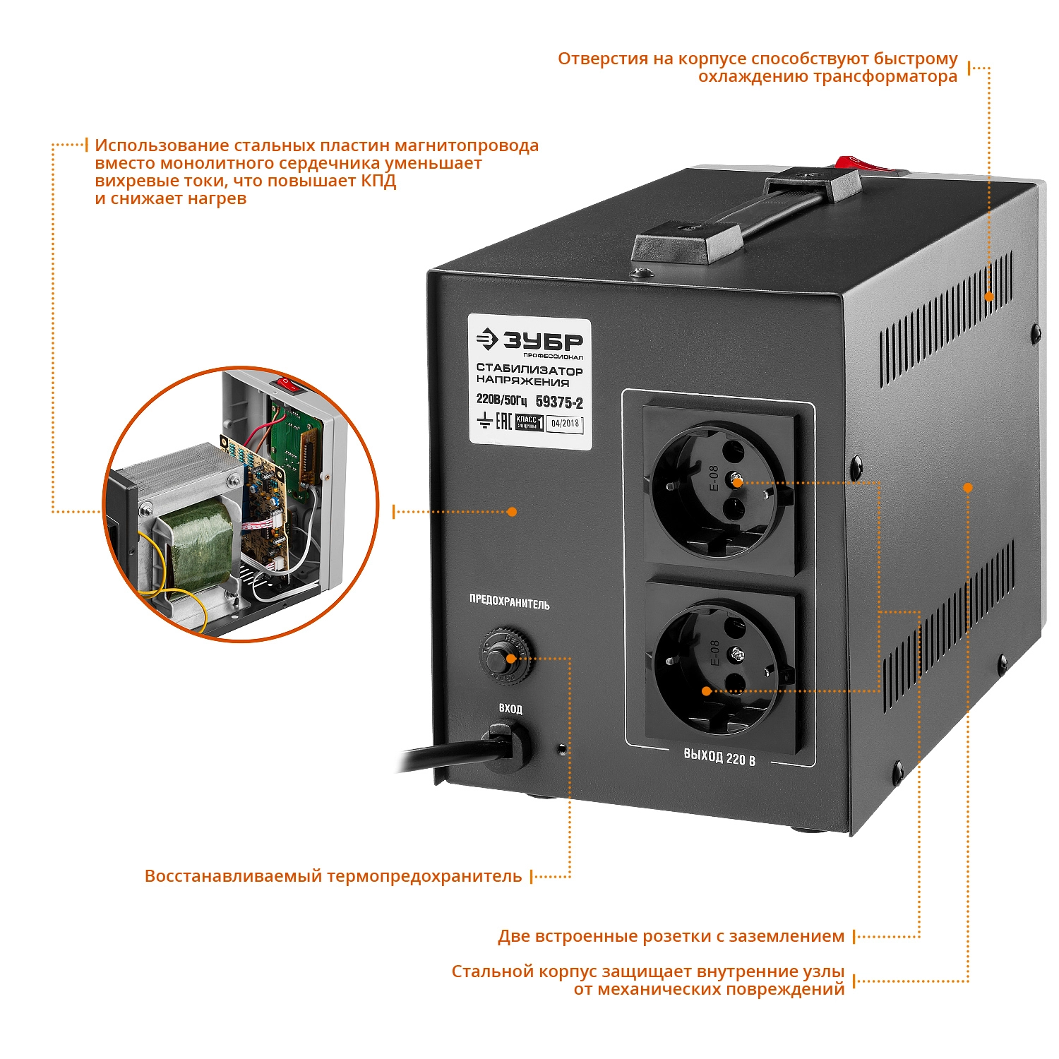 ПРОФИУровень качества. При классификации продуктов, имеющих схожее наименование, но обладающие различными потребительскими свойствами мы приняли следующий Вес факторов: 80% - подтвержденный ресурс, 15% - заявленная производительность/скорость, 5% - субъективные ощущения потребителя. ПодробнееКод товара: 0030361(0)Стабилизатор напряжения ЗУБР 59375-2, предназначен для точного и быстрого выравнивания сетевого напряжения для защиты бытовой техники и оборудования. Устройство обеспечивает эффективную защиту электроприборов от нестабильного по значению напряжения в сети. Шесть степеней защиты: от перегрузки, от короткого замыкания, от перегрева, от опасного повышенного напряжения, от опасного пониженного напряжения, от импульсных перенапряжений. Наличие задержки включения для защиты аппаратуры от бросков напряжения. Наличие термозащиты обеспечивает отключение нагрузки при повышении температуры автотрансформатора. Металлопластиковый корпус обеспечивает сохранность приборов и пожаробезопасность. Возможность автоматического отключения нагрузки при превышении предельного значения выходного напряжения. Автоматическое подключение нагрузки при восстановлении выходного. Сохранение рабочего состояния при коротких по времени перегрузках. Защита от высокого напряжения, перегрузки и перегрева. Фильтрация сетевых помех.