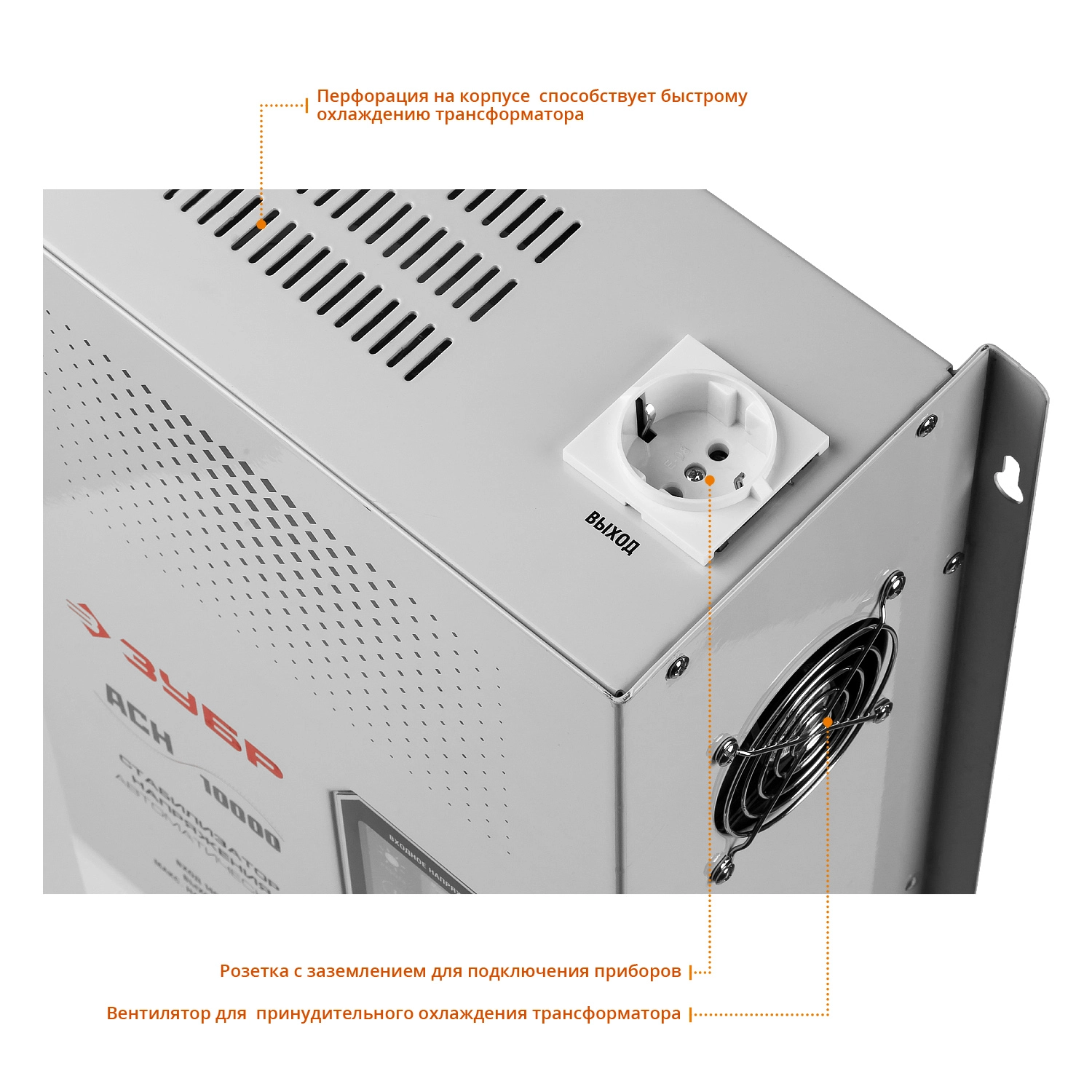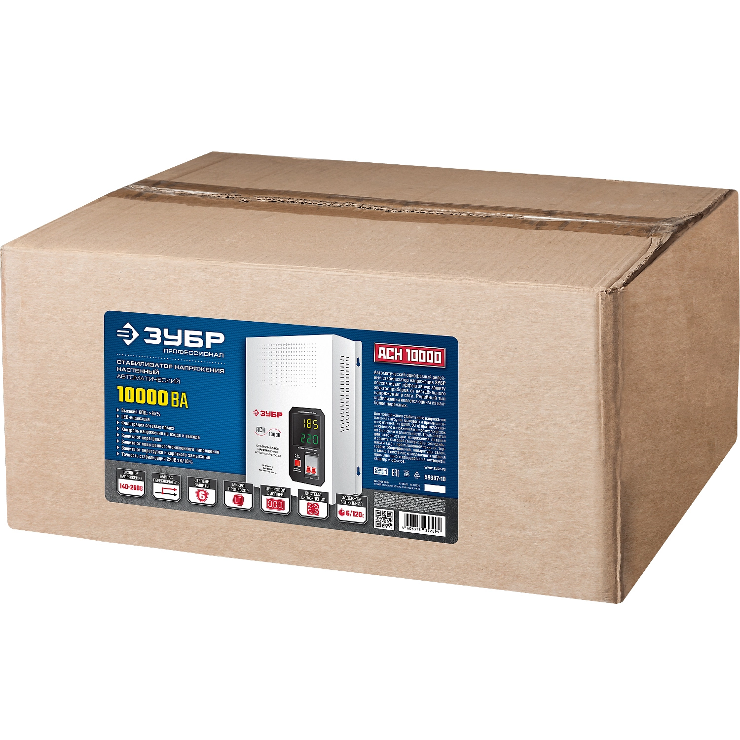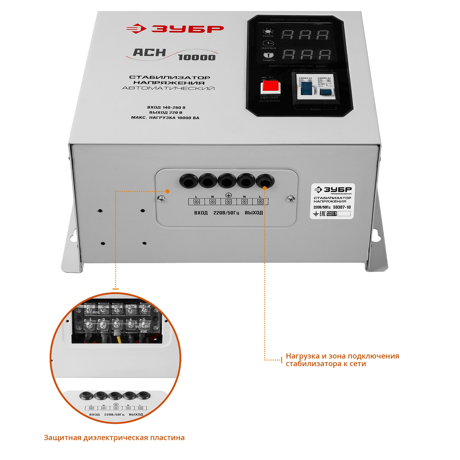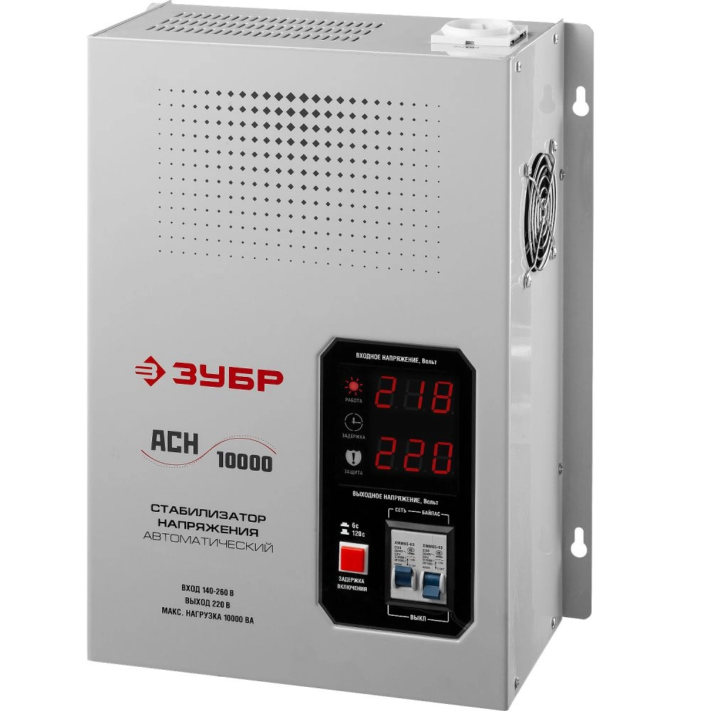 ПроизводителиСтабилизатор напряжения навесной АСН 10000 (10000 ВА, 140-260В, 8%)(59387-10) ЗУБР