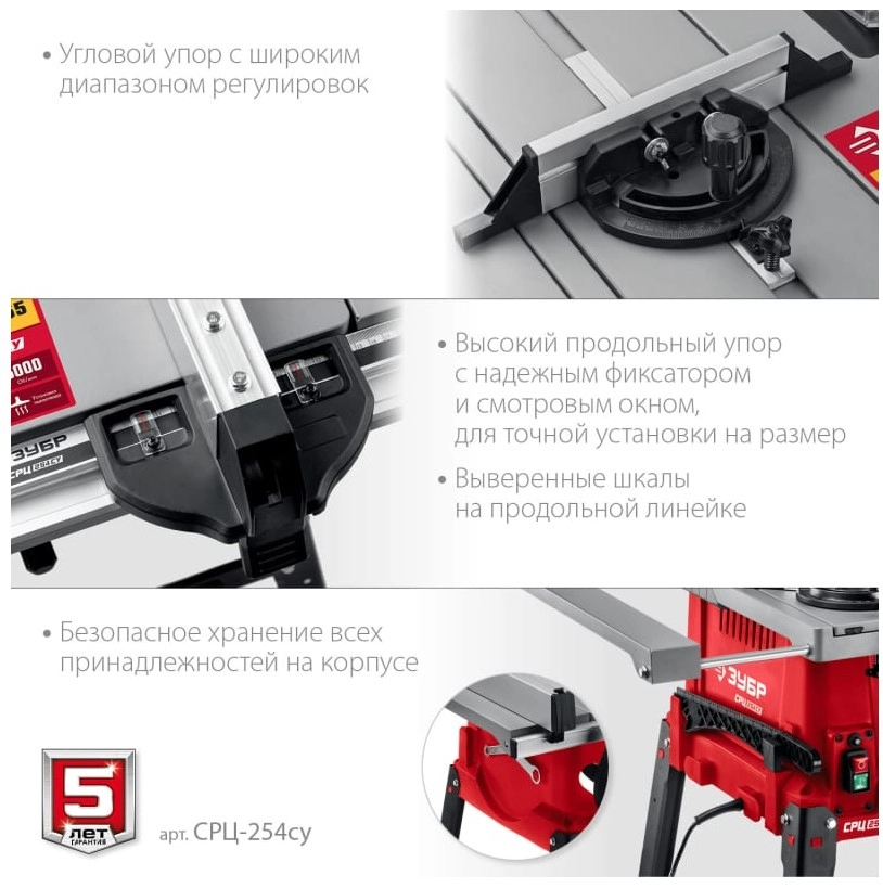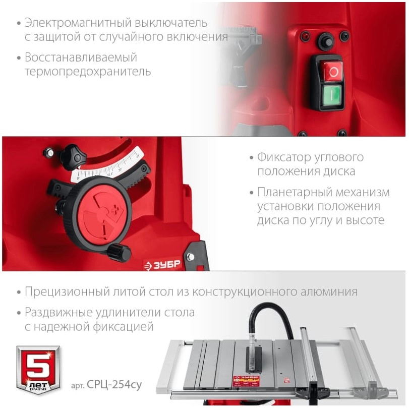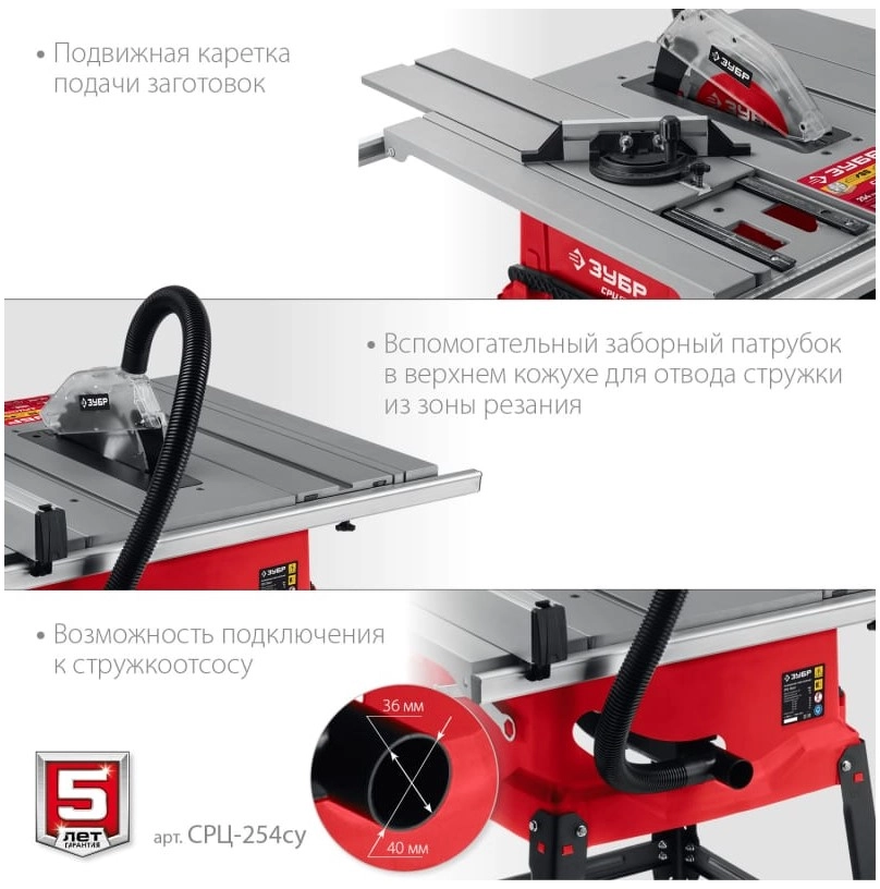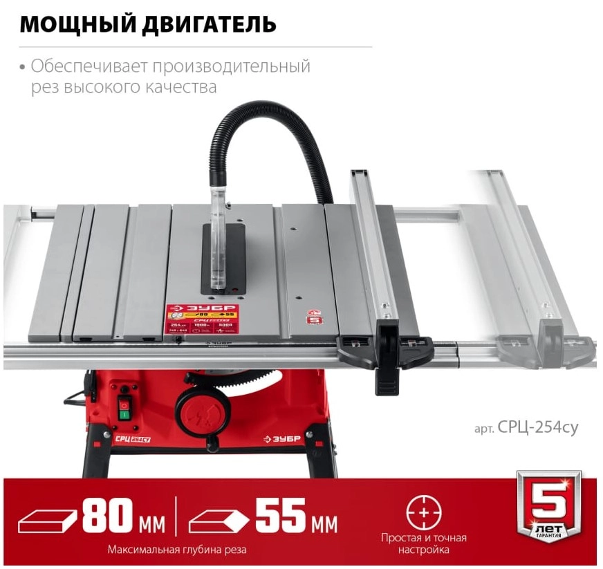 ХарактеристикиАртикул СРЦ-254суБренды ЗубрСтрана производства КитайТип распиловочный (циркулярный)Потребляемая мощность 1900Длина рабочего стола 740Назначение для обработки деревянных заготовокЦвет черный/красныйМатериал корпуса металлДиаметр диска 254Тип двигателя коллекторныйКейс в комплекте нетВес 20Мощность 1900Выполняемые работы пилениеШирина рабочего стола 640Напряжение 220VПосадочный диаметр диска 30Макс. глубина обработки (90°) 80Макс. глубина обработки (45°) 55Максимальная частота вращения 5000Способ установки напольныйМаксимальный угол наклона 45Описание товара обновлено 28.01.2026 17:03:45Распиловочный станок ЗУБР СРЦ-254су со станиной и удлинителем, применяется в деревообрабатывающей промышленности, мебельном производстве. Электромагнитный выключатель, предотвращающий случайное включение при восстановлении напряжения. Защитный кожух диска автоматически откидывается при подаче заготовки и защищает оператора от травм. Восстанавливаемая защита от перегрузки. Планетарный механизм регулировки положения диска по углу и высоте. Система пылеотвода, с дополнительным патрубком в верхнем кожухе диска, позволяет удалять стружку непосредственно из зоны резания.Производитель: Крафтул И/Е Гмбх, Альтер Поствег Штр., Лоенинген, Германия