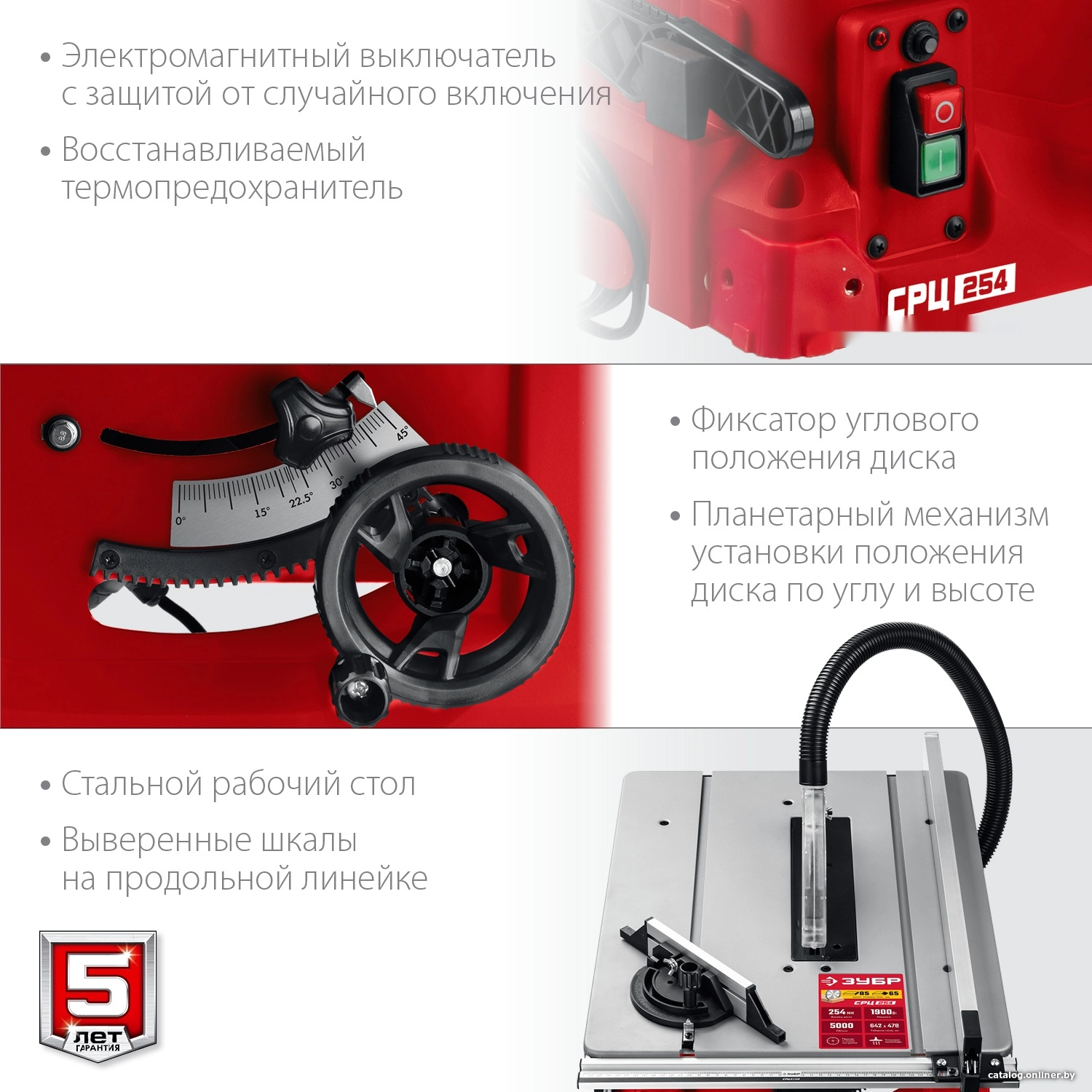 ХарактеристикиАртикул СРЦ-254Бренды ЗубрСтрана производства КитайТип распиловочный (циркулярный)Потребляемая мощность 1900Длина рабочего стола 478Скорость вращения 5000Диаметр диска 254Кейс в комплекте нетВес 20Мощность 1900Выполняемые работы пилениеШирина рабочего стола 642Напряжение 220VПосадочный диаметр диска 30Длина 50Макс. глубина обработки (45°) 65Ширина 69Высота 54Регулировка угла наклона стола нетОписание товара обновлено 28.01.2026 17:02:52Распиловочный станок ЗУБР СРЦ-254 предназначен для большинства работ по дереву: продольного, наклонного, косого и комбинированного распила. Применяется в деревообрабатывающей промышленности, мебельном производстве. Электромагнитный выключатель, предотвращающий случайное включение при восстановлении напряжения. Защитный кожух диска автоматически откидывается при подаче заготовки и защищает оператора от травм. Восстанавливаемая защита от перегрузки. Планетарный механизм регулировки положения диска по углу и высоте. Система пылеотвода, с дополнительным патрубком в верхнем кожухе диска, позволяет удалять стружку непосредственно из зоны резания.Производитель: Крафтул И/Е Гмбх, Альтер Поствег Штр., Лоенинген, Германия