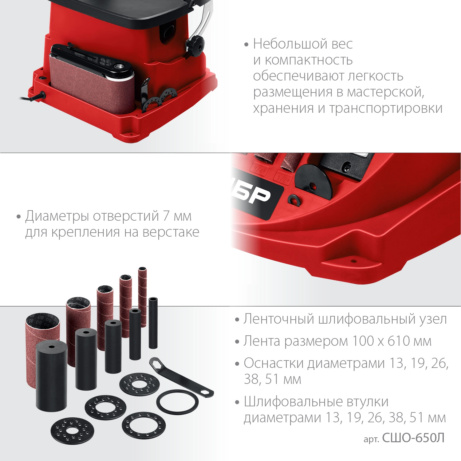 ПроизводителиСтанок шлиф. осцилляционный шпиндельный СШО-650Л (650 Вт, лента 100х610мм, кор.) ЗУБР