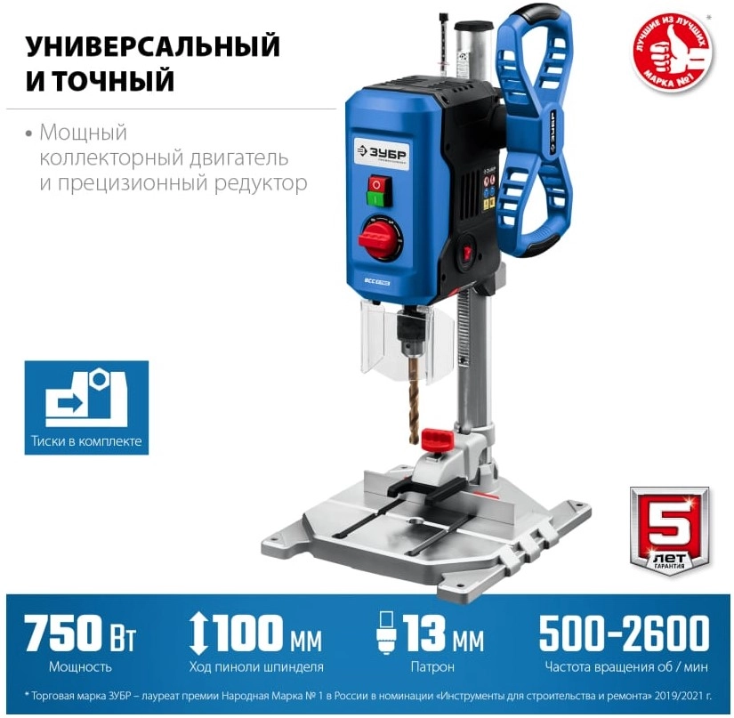ХарактеристикиАртикул ВСС-П750Бренды ЗубрСтрана производства КитайТип сверлильныйПотребляемая мощность 750Количество скоростей 1Длина рабочего стола 320Материал корпуса металлВес 8Мощность 750Управление полуавтоматическоеШирина рабочего стола 225Напряжение 220VМакс. диаметр сверла 13Длина 320Ширина 260Высота 630Расстояние между центрами 275Питание от сети 220 В ДаОписание товара обновлено 28.01.2026 17:08:28Станок сверлильный ЗУБР ВСС-П750, предназначен для сверления отверстий в заготовках из различных материалов. Быстрозажимные тиски позволяют надёжно фиксировать даже круглые заготовки, обеспечивая высокую точность выполняемых отверстий. Лазерный указатель точно указывает точку вхождения сверла в материал, обеспечивая быстрое получение точного результата. Электронная регулировка частоты вращения шпинделя.