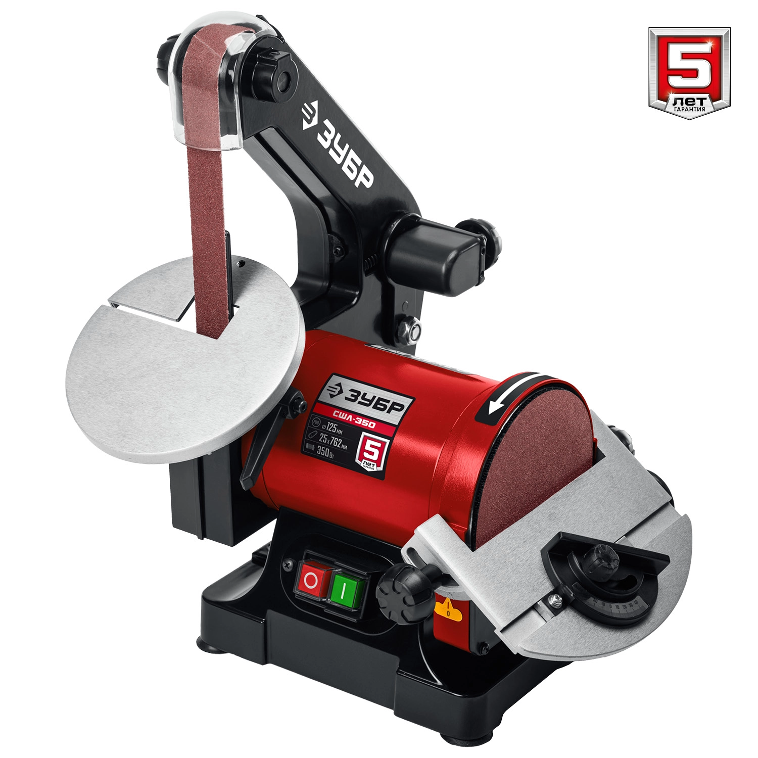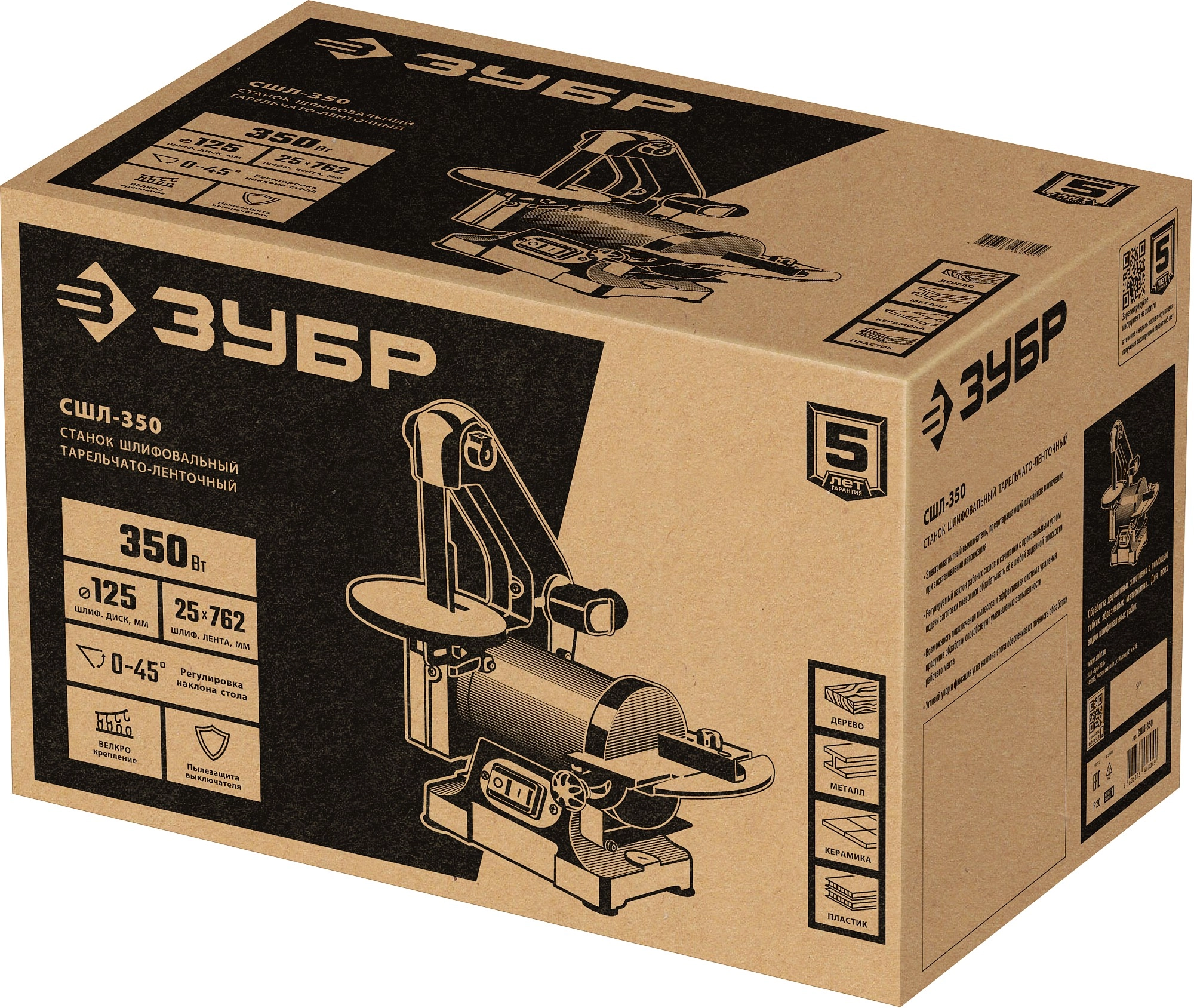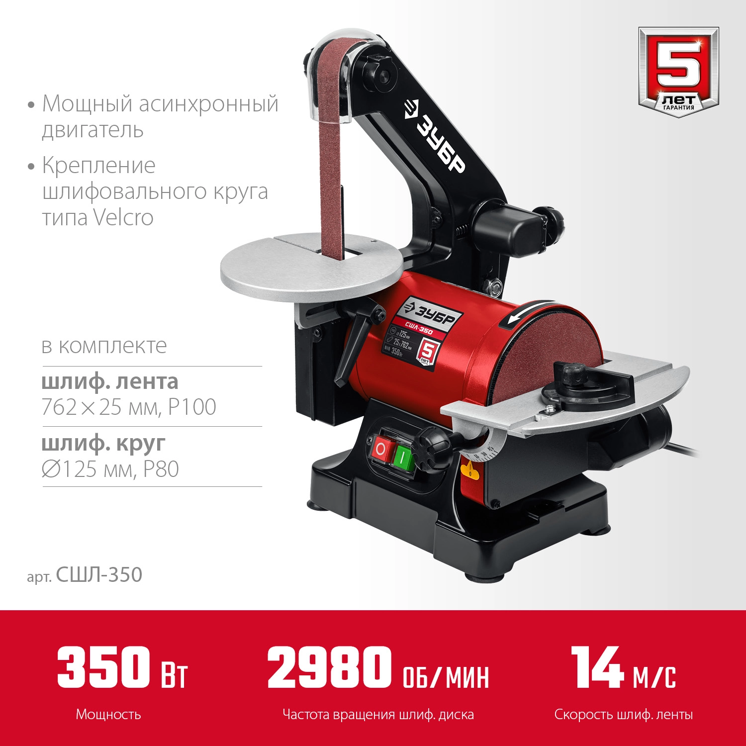 ПроизводителиСтанок тарельчато-ленточный шлифовальный СШЛ-350 (350 Вт, круг 125 мм, лента 762x25 мм, кор.) ЗУБР