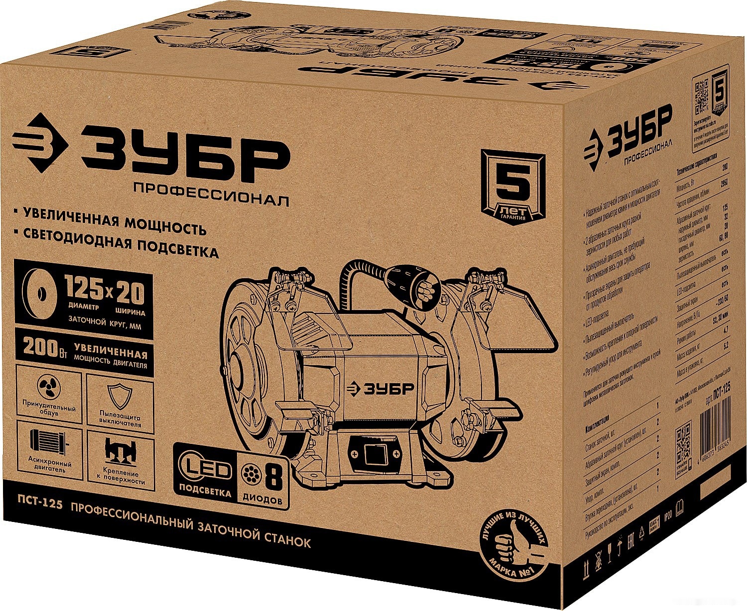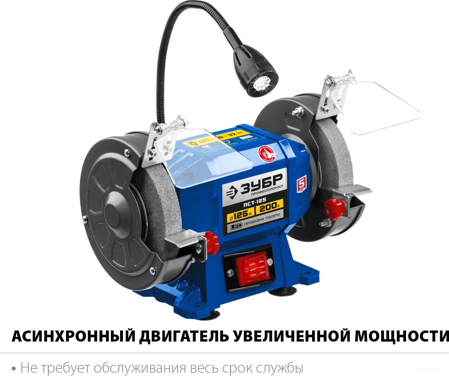 ХарактеристикиАртикул ПСТ-125Бренды ЗубрСтрана производства КитайТип универсальныйТип питания сетьПотребляемая мощность 200Посадочный диаметр 32Толщина круга 20Диаметр диска 125Кейс в комплекте нетВес 4.7Мощность двигателя 200Частота вращения шлиф. круга 2950Толщина круга 20Возможность подсоединения пылесоса НетЭлектропитание однофазноеВлажная заточка НетПодсветка рабочей зоны ДаКомплект поставки Станок заточной Абразивный заточной круг (установлен) - 2 шт Защитный экран- 2 Упор - 2 Переходные втулки - 2 шт Руководство по эксплуатацииОписание товара обновлено 28.01.2026 17:05:35Станок точильный ЗУБР ПСТ-125, предназначен для заточки и шлифовки металлических заготовок и режущего инструмента. Двигатель большой мощности способен выполнить даже самую тяжелую работу. Два круга разной зернистости для любых работ. Асинхронный двигатель, не требующий обслуживания весь срок службы. LED подсветка рабочей зоны. Прозрачные экраны для защиты оператора от продуктов обработки. Пылезащищенный выключатель для беспроблемной эксплуатации. Возможность крепления к опорной поверхности. Регулируемый упор для инструмента. Зернистость круга, P: 60/80