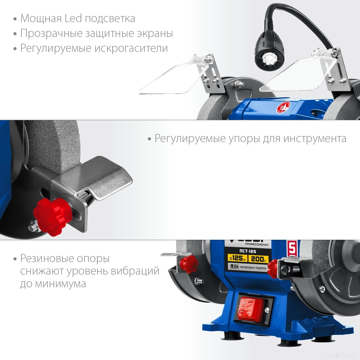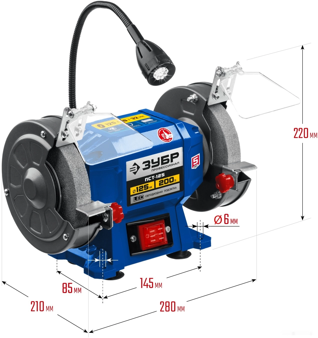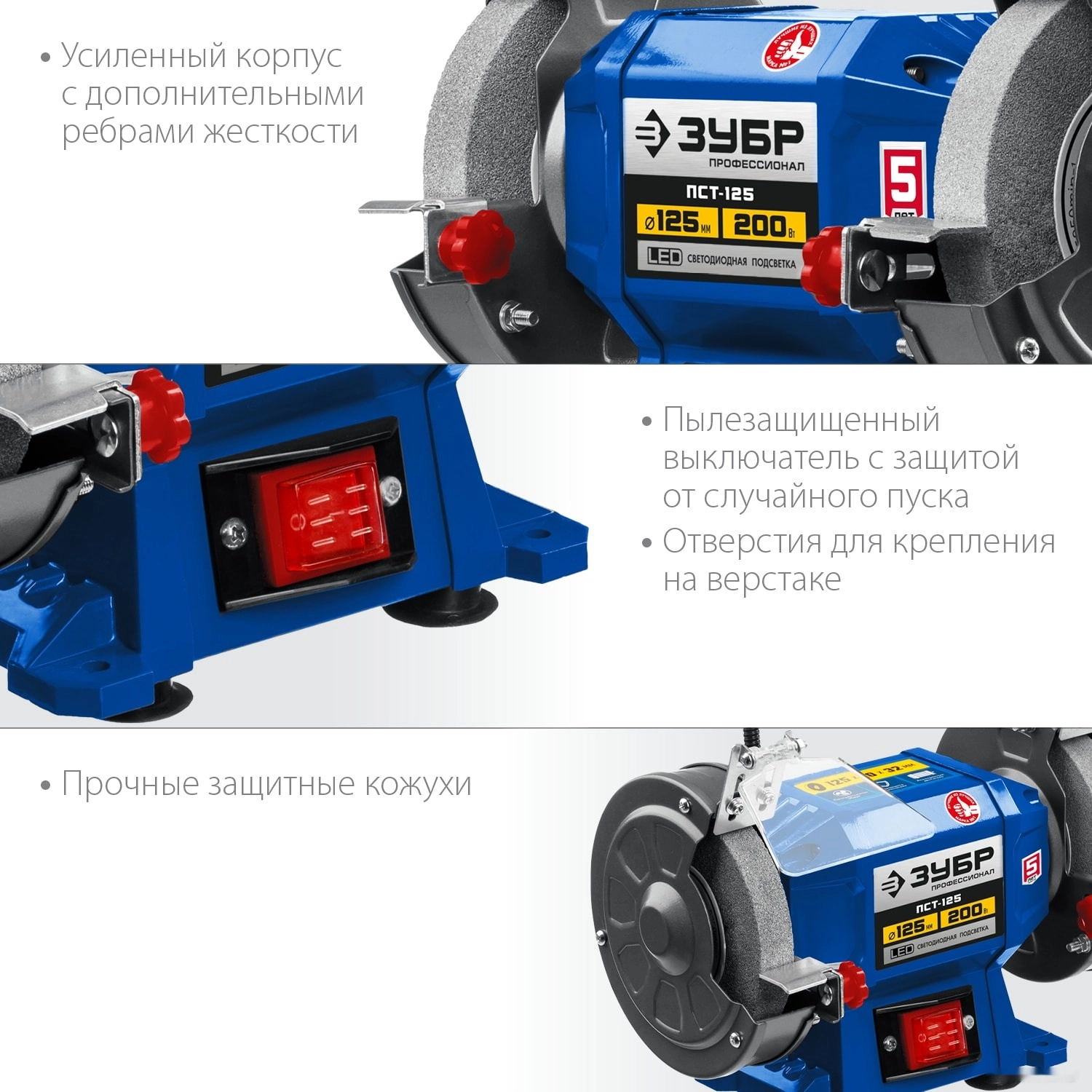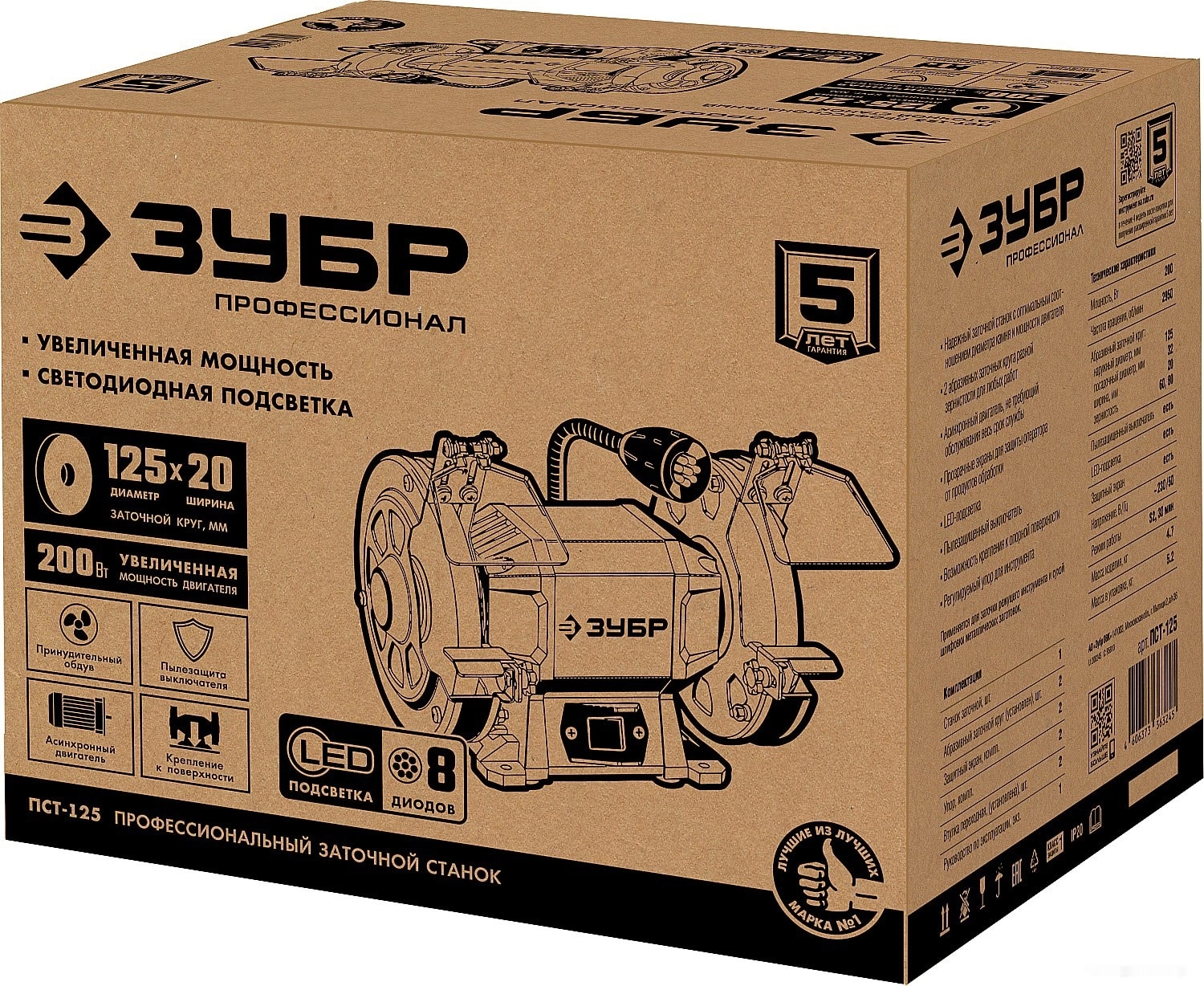 ХарактеристикиАртикул ПСТ-125Бренды ЗубрСтрана производства КитайТип универсальныйТип питания сетьПотребляемая мощность 200Посадочный диаметр 32Толщина круга 20Диаметр диска 125Кейс в комплекте нетВес 4.7Мощность двигателя 200Частота вращения шлиф. круга 2950Толщина круга 20Возможность подсоединения пылесоса НетЭлектропитание однофазноеВлажная заточка НетПодсветка рабочей зоны ДаКомплект поставки Станок заточной Абразивный заточной круг (установлен) - 2 шт Защитный экран- 2 Упор - 2 Переходные втулки - 2 шт Руководство по эксплуатацииОписание товара обновлено 28.01.2026 17:05:35Станок точильный ЗУБР ПСТ-125, предназначен для заточки и шлифовки металлических заготовок и режущего инструмента. Двигатель большой мощности способен выполнить даже самую тяжелую работу. Два круга разной зернистости для любых работ. Асинхронный двигатель, не требующий обслуживания весь срок службы. LED подсветка рабочей зоны. Прозрачные экраны для защиты оператора от продуктов обработки. Пылезащищенный выключатель для беспроблемной эксплуатации. Возможность крепления к опорной поверхности. Регулируемый упор для инструмента. Зернистость круга, P: 60/80