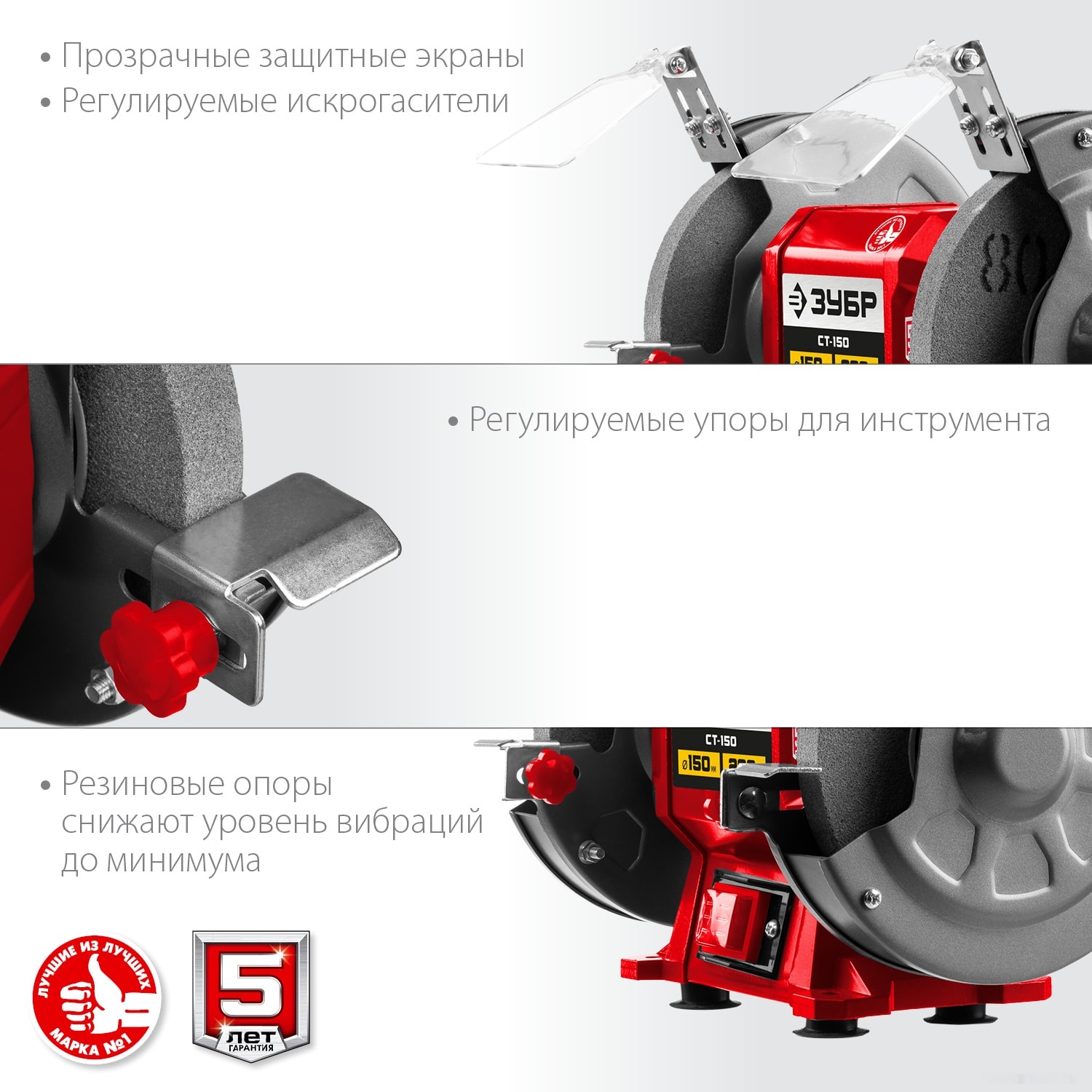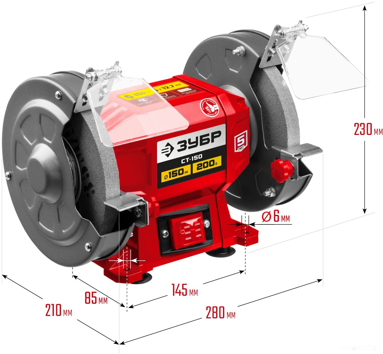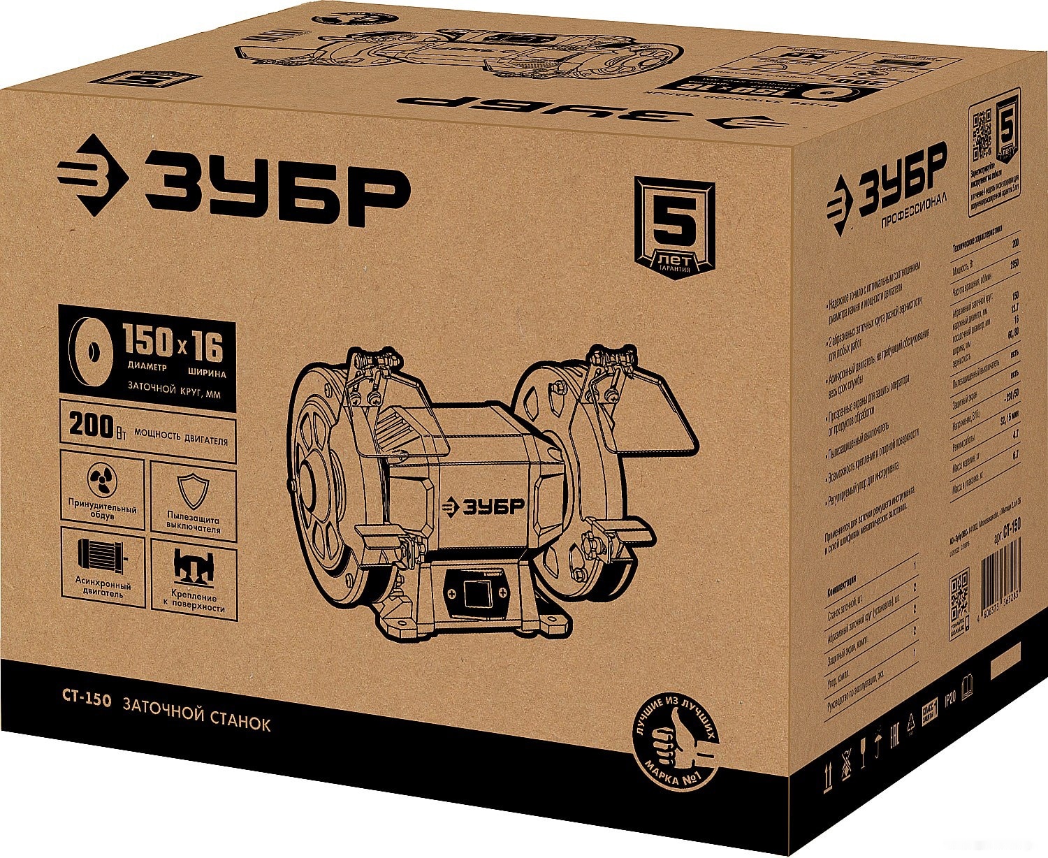 ХарактеристикиАртикул СТ-150Бренды ЗубрСтрана производства КитайТип универсальныйТип питания сетьПотребляемая мощность 200Посадочный диаметр 12.7Диаметр диска 150Кейс в комплекте нетВес 5.7Мощность двигателя 200Частота вращения шлиф. круга 2950Толщина круга 16Возможность подсоединения пылесоса НетЭлектропитание однофазноеВлажная заточка НетПодсветка рабочей зоны НетКомплект поставки Станок заточной Защитный экран - 2 Упор - 2 Руководство по эксплуатацииОписание товара обновлено 08.12.2025 13:40:35Станок точильный ЗУБР СТ-150, предназначен для заточки и сухой шлифовки металлических заготовок и режущего инструмента. Незаменимый инструмент для гаража, мастерской и используемый для заточки и сухой шлифовки металлических заготовок и режущего инструмента. Имеет простую конструкцию, высокую надежность, компактный размер, два камня с разной зернистостью – все, что нужно для настоящего мастера, ценящего качество. Есть пылезащищенный выключатель для беспроблемной эксплуатации. Для защиты оператора от продуктов обработки имеются прозрачные экраны. Возможность крепления к опорной поверхности.Производитель: Крафтул И/Е Гмбх, Альтер Поствег Штр., Лоенинген, Германия