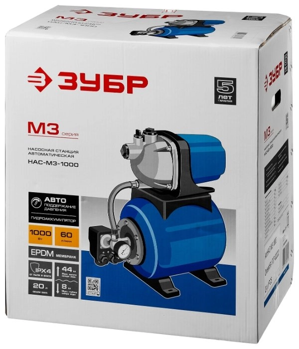 ПроизводителиСтанция насосная ЗУБР "МАСТЕР" М3 автоматическая, 1000 Вт, пропускная способность 60 л/мин, напор 44