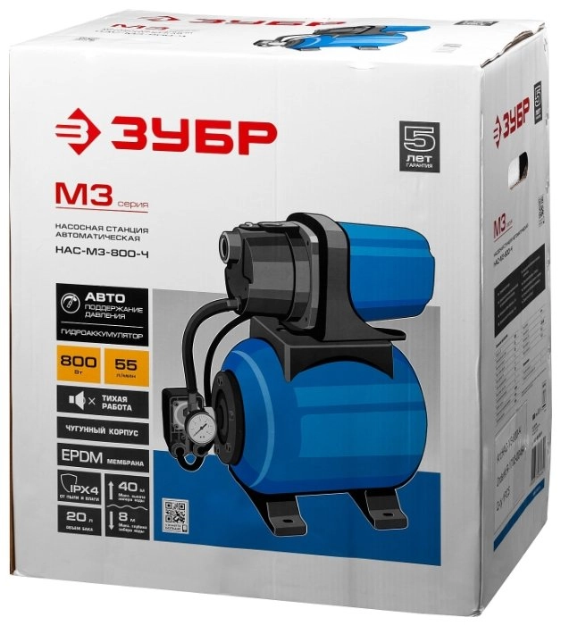 ПроизводителиСтанция насосная ЗУБР "МАСТЕР" М3 автоматическая, 800 Вт, пропускная способность 55 л/мин НАС-М3-800