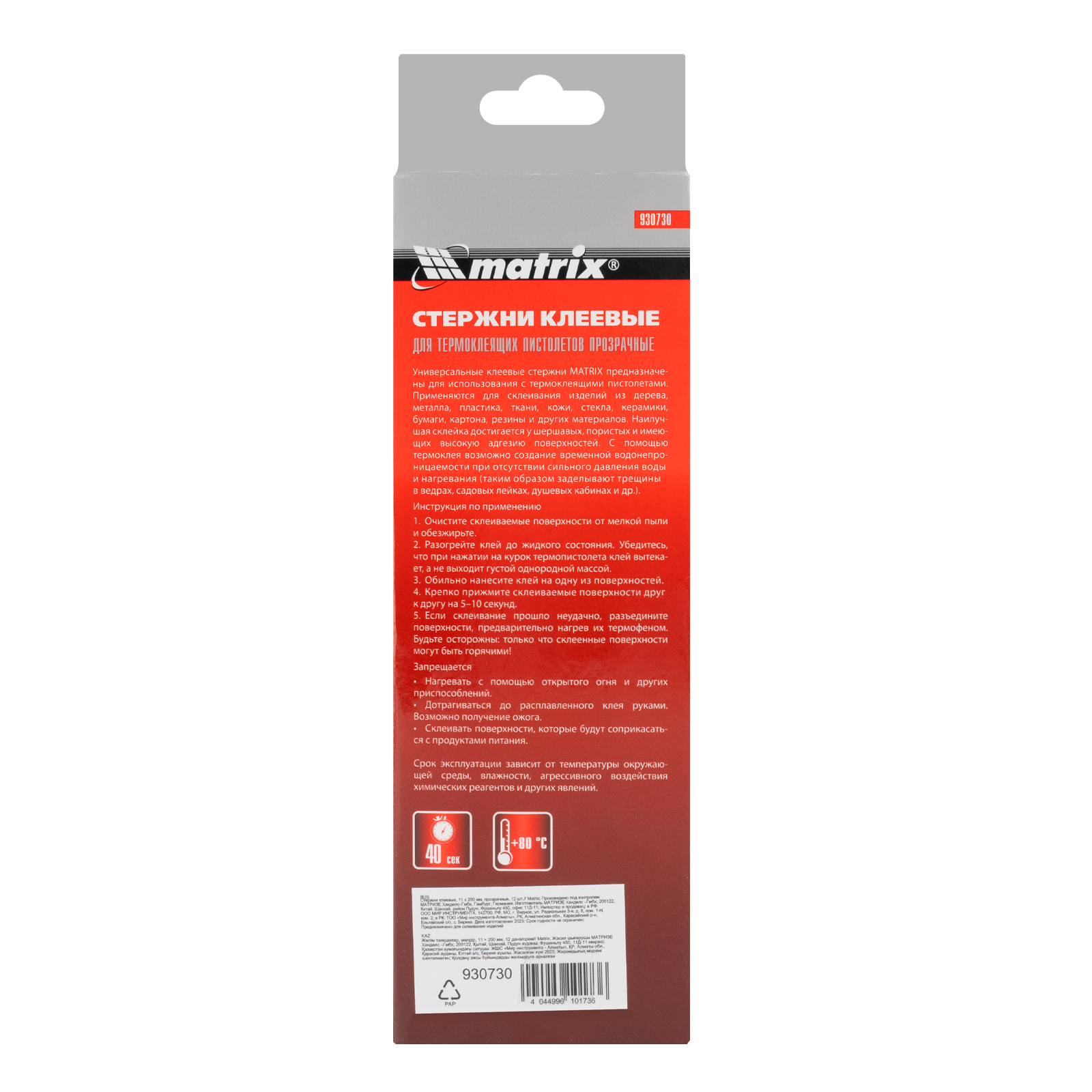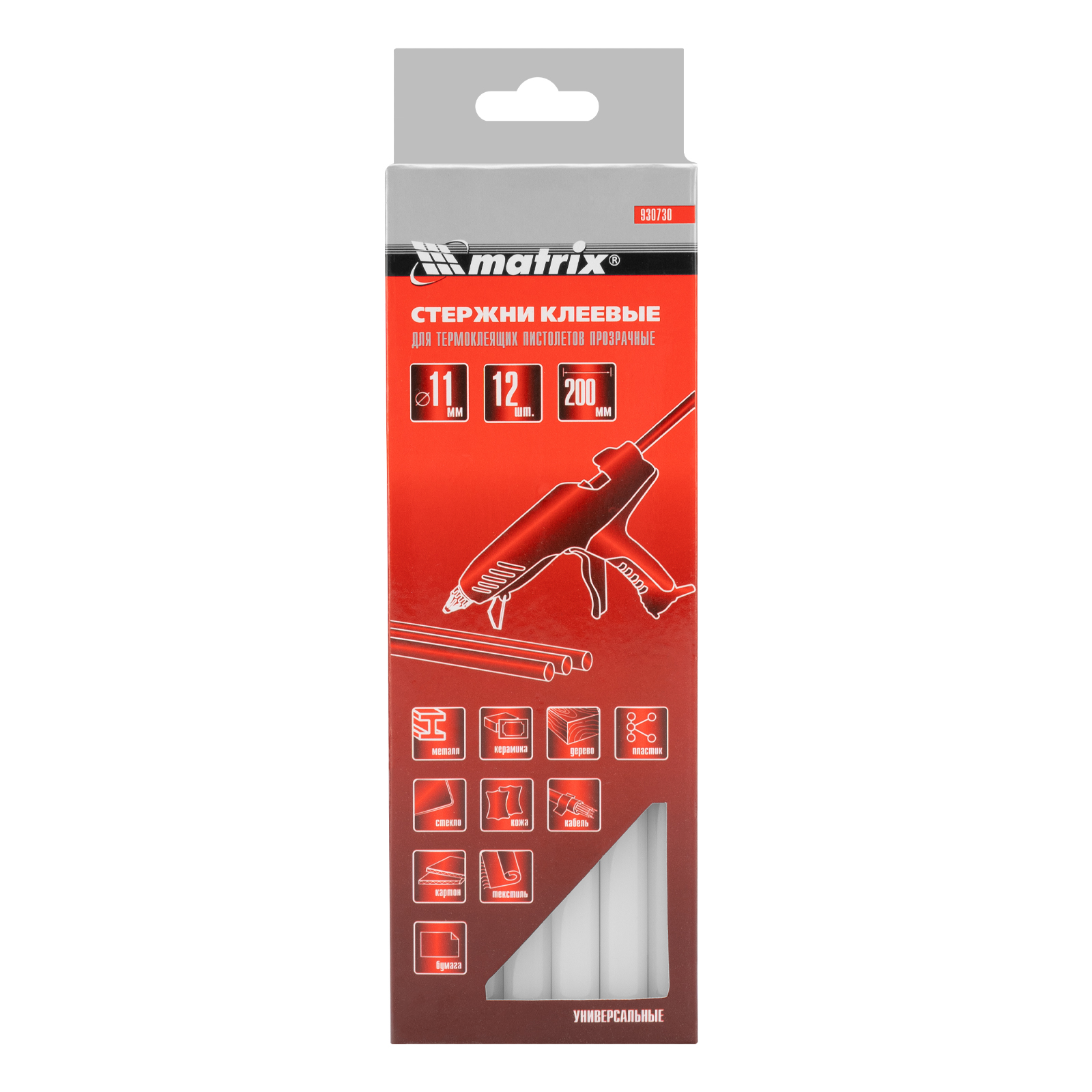 ПроизводителиСтержни для клеевых пистолетов, прозрачные, 11мм х 200 мм, 12шт. (930730) MATRIX