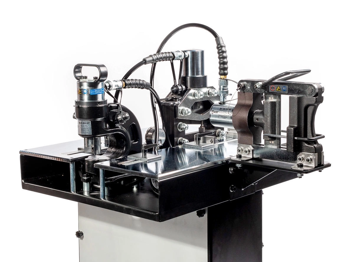 В комплекте: рабочий стол 850х700х1200 мм электрогидравлическая помпа ПМЭ-7050 пресс для гибки ШГ-150 NEO сменные пуансоны для гибки: R5, R10 пресс для резки ШР-150 NEO пресс для перфорации ШД-95 NEO набор из 6 сменных перфоформ МПШО-6/8/10/12/16/20