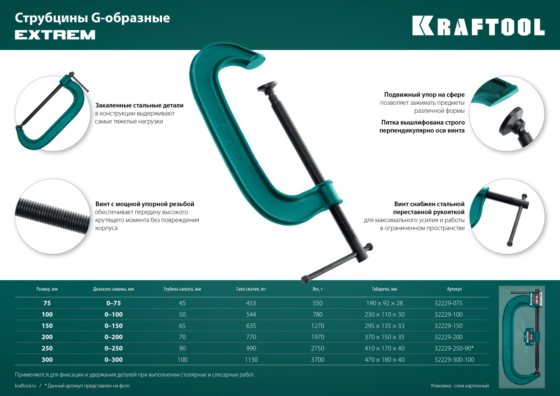 Профессиональные струбцины KRAFTOOL EXTREM G с литым металлическим корпусом, соответствуют самым высоким техническим требованиям. Корпус изготовлен из высокопрочного чугуна с добавлением шаровидного графита и имеет высокую стойкость к ударным воздействиям при выполнении тяжелых слесарных работ. Обладают повышенным ресурсом, обеспечивают длительную и качественную работу.