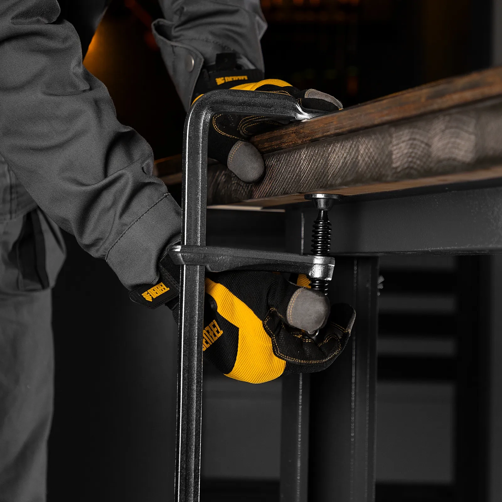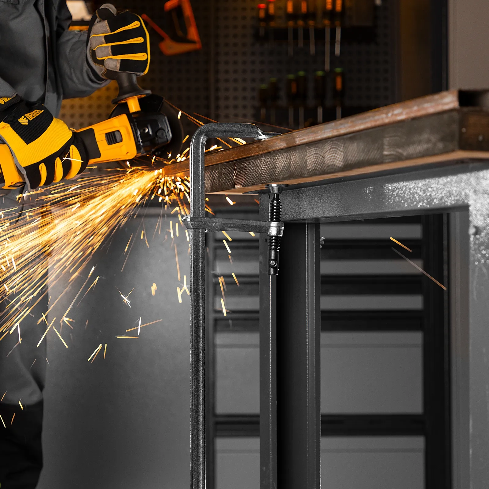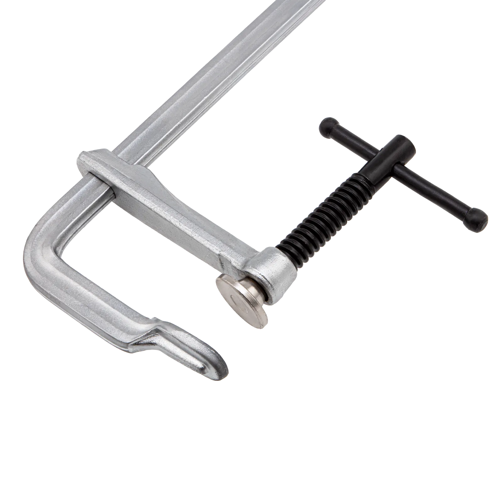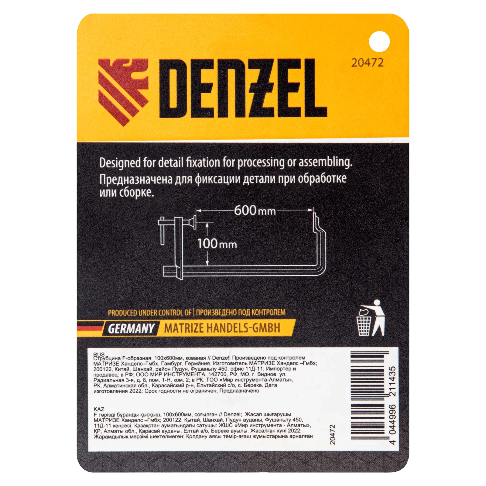 Кованая F-образная струбцина Denzel 20472 с глубиной зажима 100 мм, усиленная, предназначена для фиксации деталей шириной до 600 мм и материалов при проведении слесарных, столярных и сварочных работ. Тавровый профиль обеспечивает устойчивость конструкции к изгибу, что позволяет фиксировать детали со значительным усилием. Струбцина подходит для профессионального применения.Производитель: ООО "Мир инструмента", Россия
