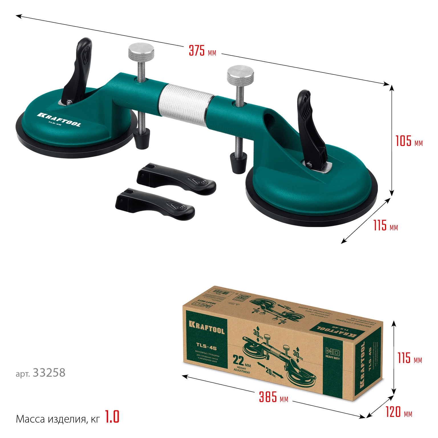 Струбцина с двумя присосками создает нагрузку до 45 кг для выравнивания шва. Регулятор в центре ручки позволяет отрегулировать величину шва между плитками.