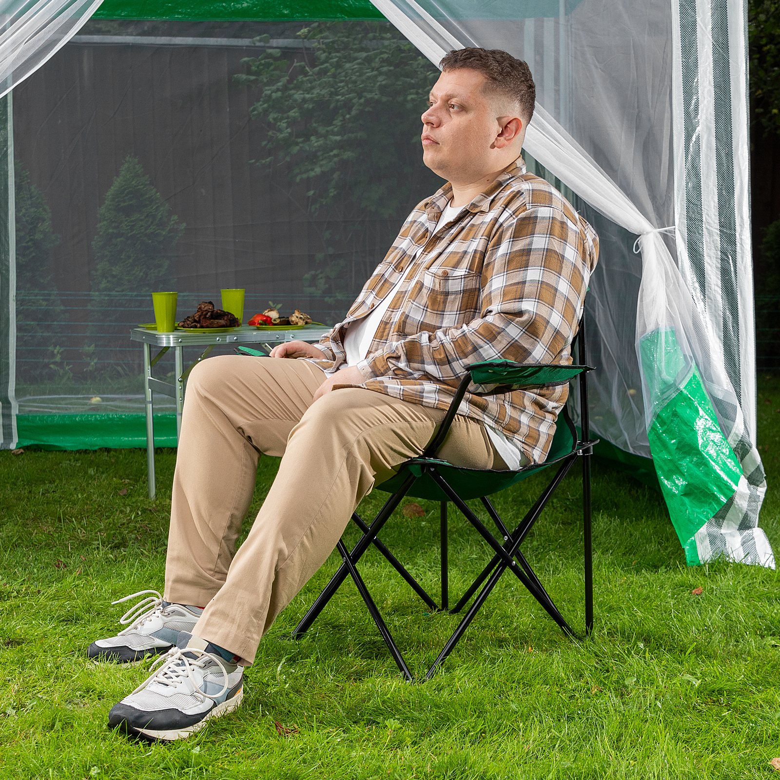 Складной стул Palisad Camping 69608 с подлокотниками и подстаканником, 81 х 51 х 86 см, можно взять с собой на пикник или на рыбалку, поставить на дачном участке или предложить гостям.