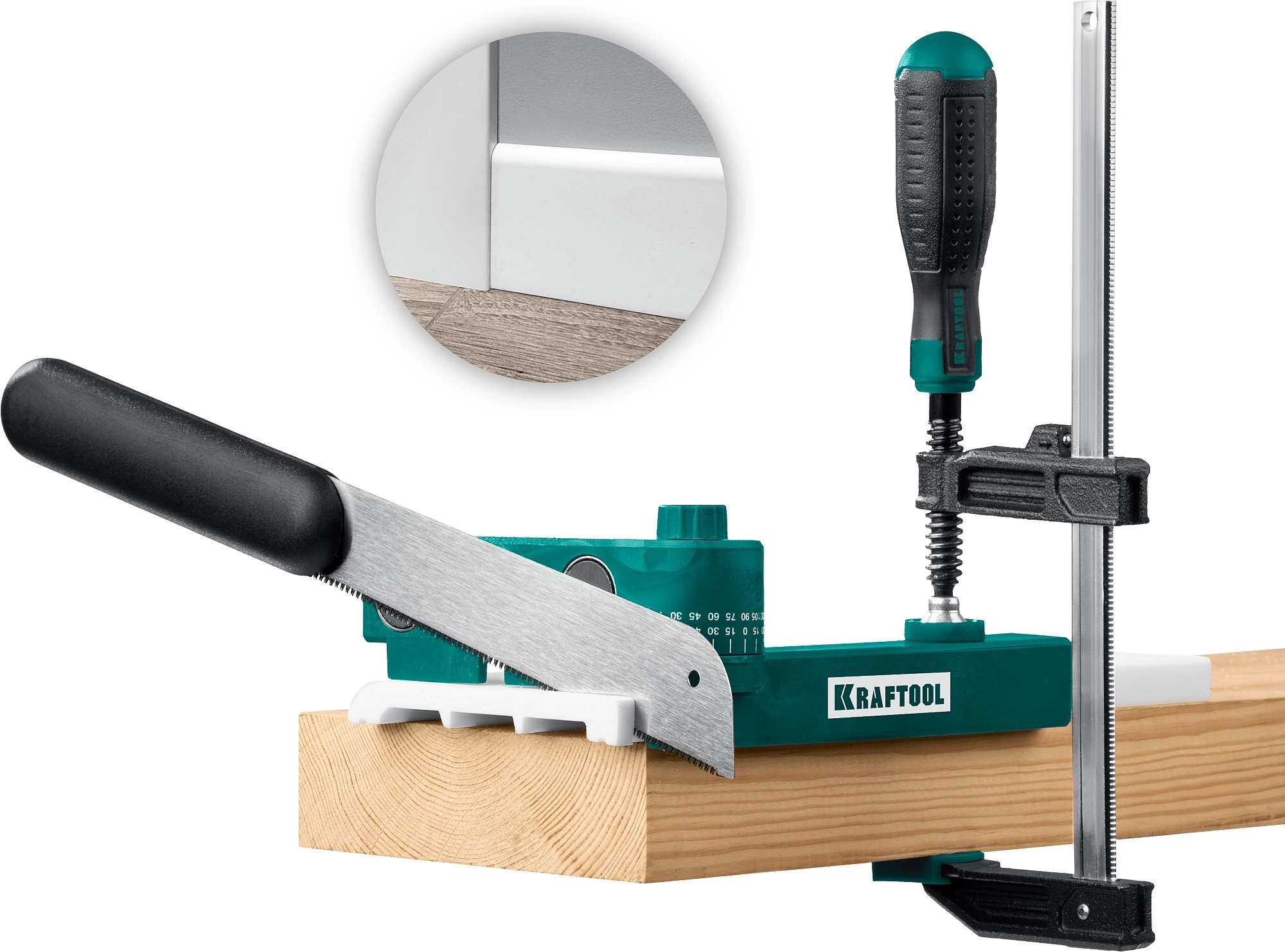 Для точного распила заготовок неограниченного размера из древисины и пластика под углом от 15° до 180° с шагом изменения угла 15° (15°, 30°, 45°, 60°, 75°, 90°, 105°, 120°, 135°, 150°, 165°, 180°)