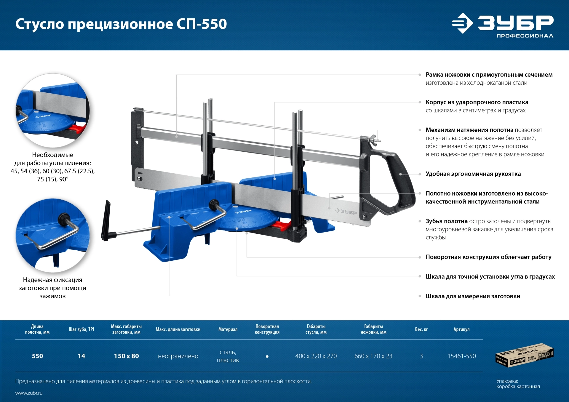 Прецизионное стусло ЗУБР СП-550 550 мм 15461-550 используется для пиления материалов из древесины, пластика, под заданным углом в горизонтальной плоскости.