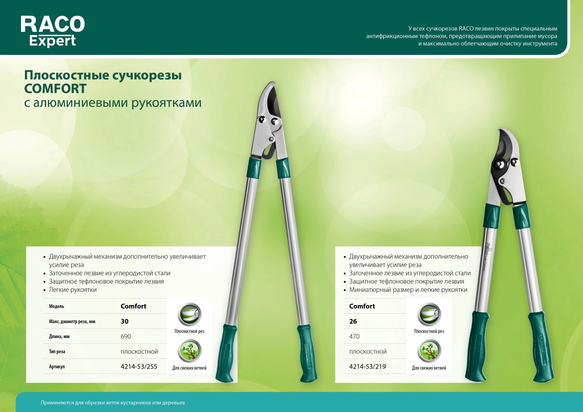 ПроизводителиСучкорез малый плоскостной двурычажный, с алюм. рукоятками (4214-53/219) Raco