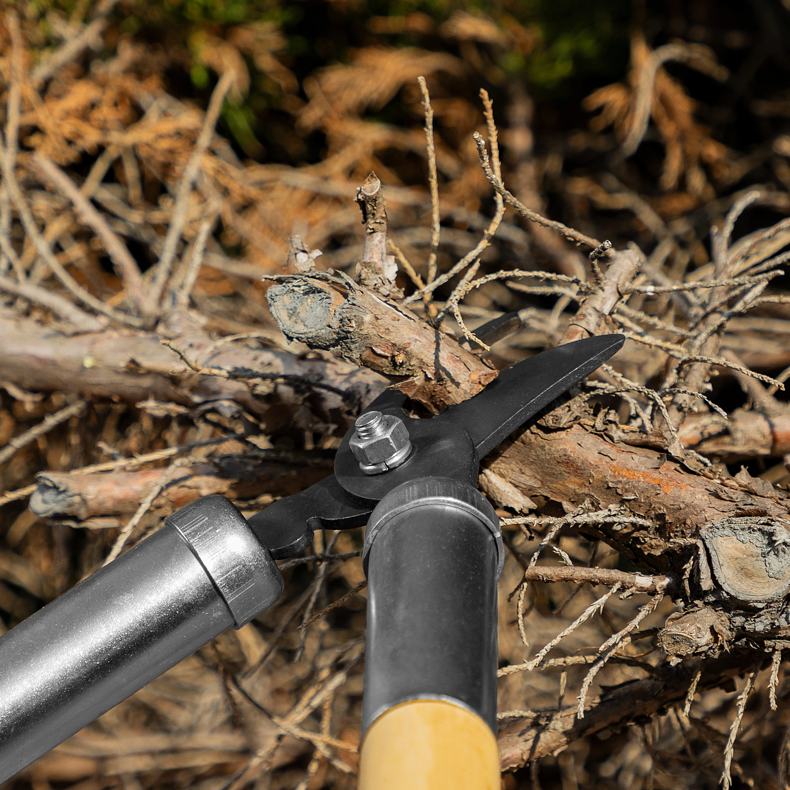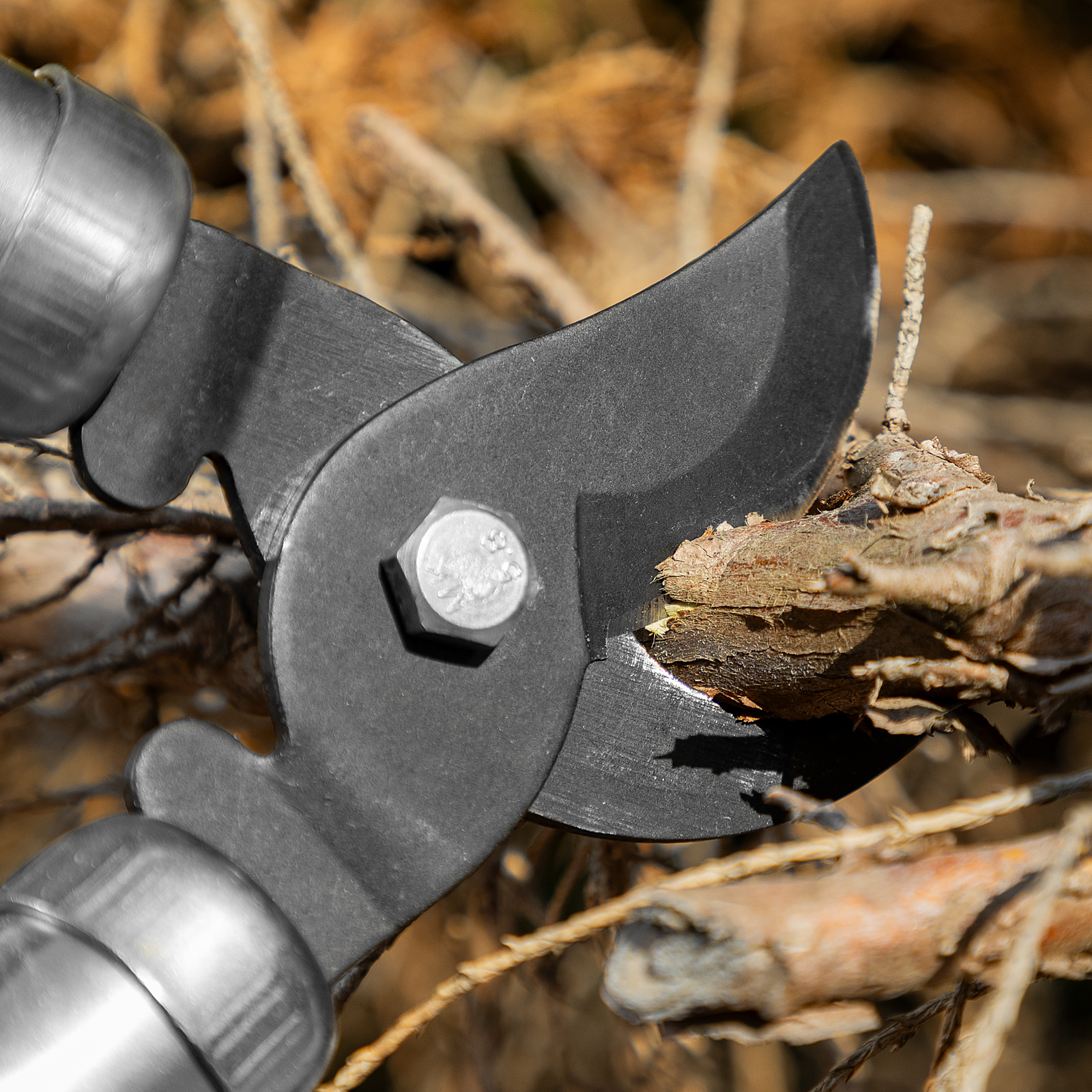 Оснащен длинными ручками, успешно справляется с живыми ветками диаметром до 25 мм.