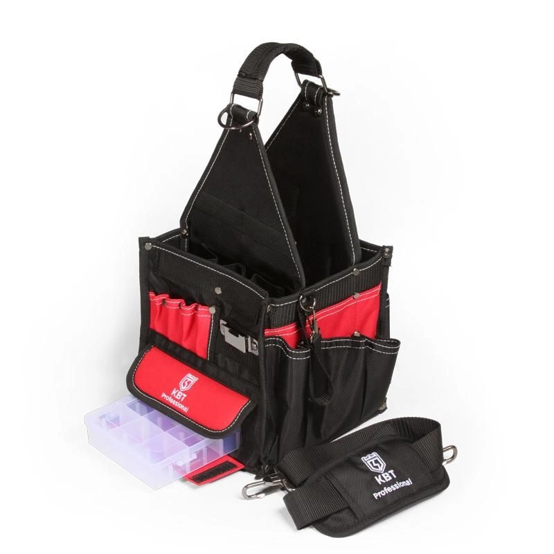 7 карманов, 4 мини-кармана для узких предметов, 1 крепежный элемент с металлическим карабином и 1 металлический держатель для рулетки на боковых сторонах