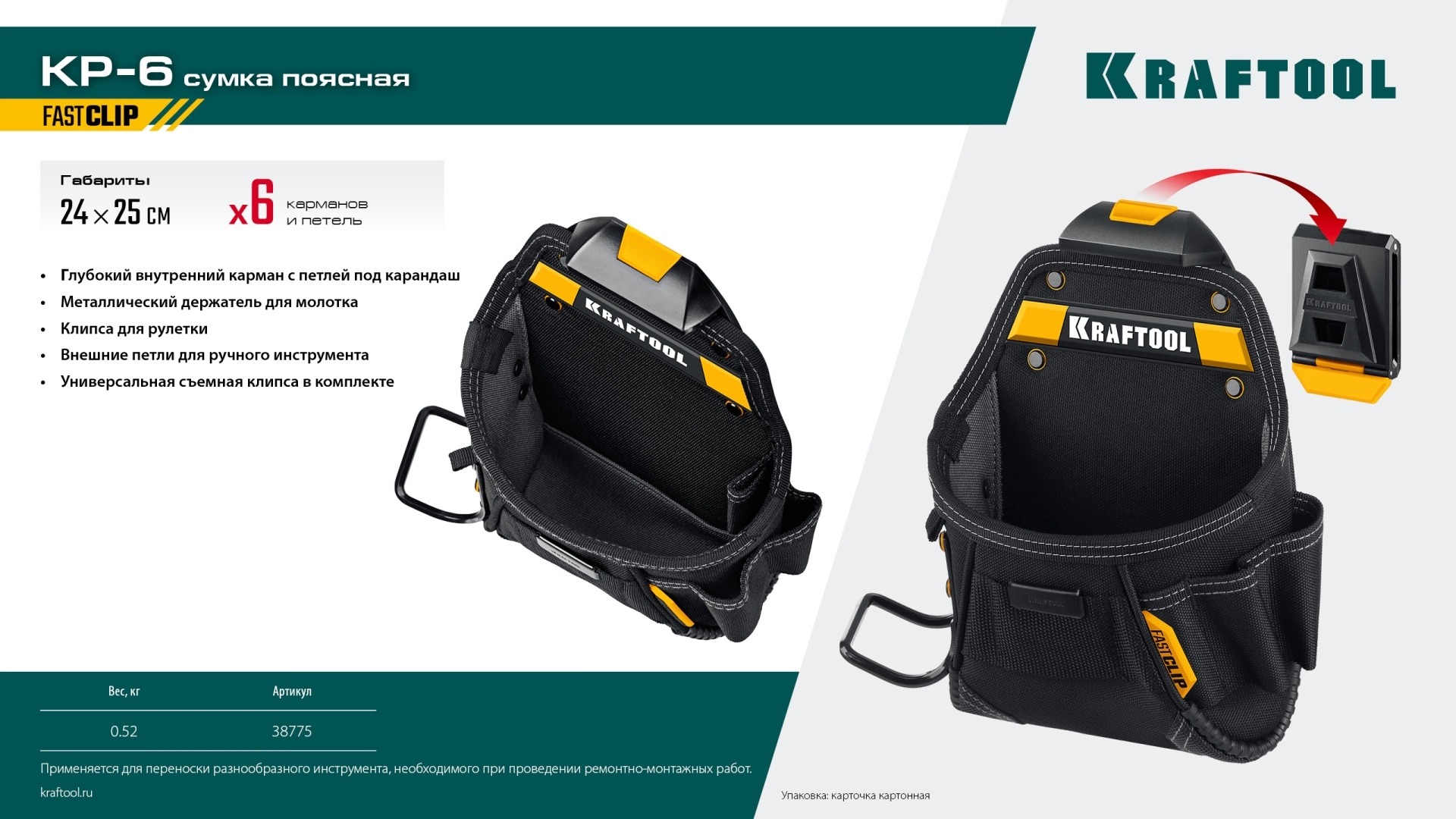 Бренд: KRAFTOOLПрофессиональные пояса и сумки KRAFTOOL KRAFTBUILT с системой быстросъёмного крепежа предлагают уникальную возможность организации рабочего процесса. Используйте только только тот инструмент, который нужен именно сейчас.