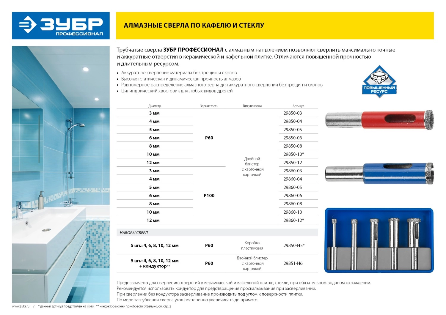 ПРОФИУровень качества. При классификации продуктов, имеющих схожее наименование, но обладающие различными потребительскими свойствами мы приняли следующий Вес факторов: 80% - подтвержденный ресурс, 15% - заявленная производительность/скорость, 5% - субъективные ощущения потребителя. ПодробнееКод товара: 0022220(0)Алмазные трубчатые сверла ЗУБР отличаются повышенной прочностью и долгим сроком службы.ХарактеристикиАртикул 29860-05Бренды ЗубрСтрана производства КитайДиаметр, мм 5Хвостовик цилиндрическийКласс точности АВес 0.01Алмазные трубчатые сверла ЗУБР отличаются повышенной прочностью и долгим сроком службы.