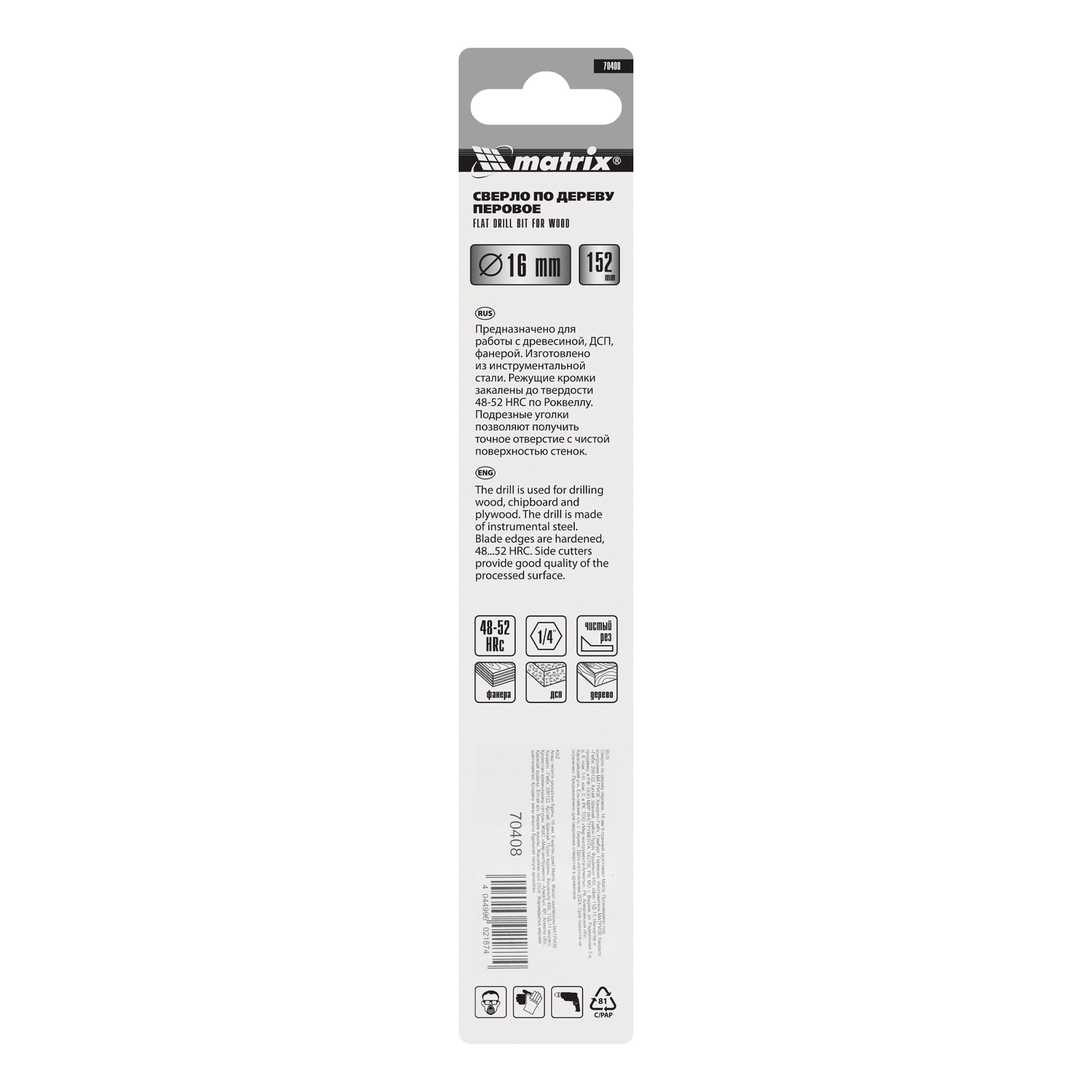 Перовое сверло по дереву Matrix 70408 диаметром 16 мм, с 6-гранным хвостовиком, имеет «лопатку» с режущими кромками по бокам, поэтому эффективно осуществляет сверление глубоких сквозных и глухих отверстий.