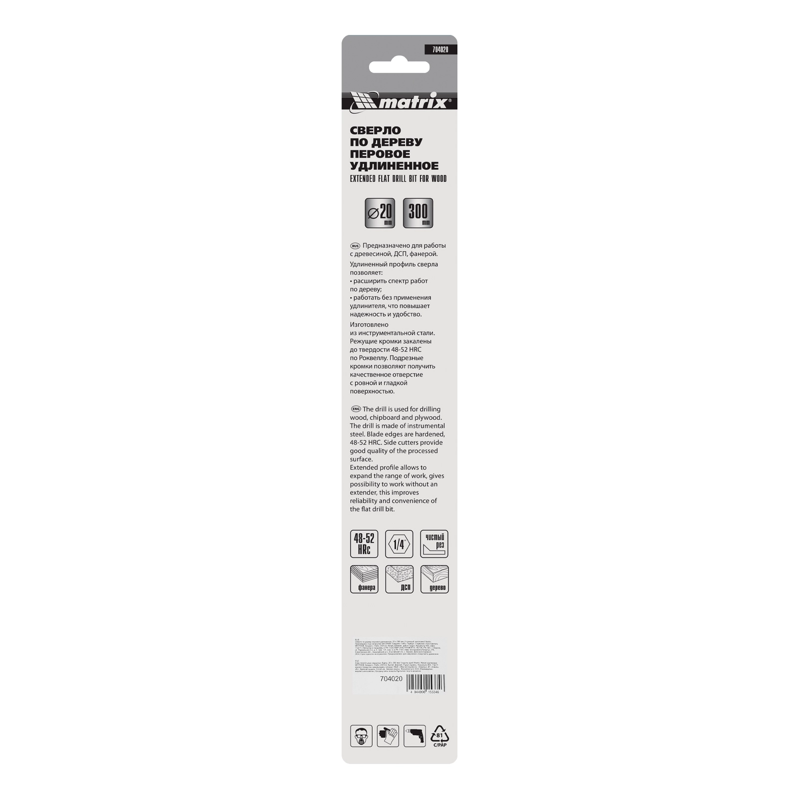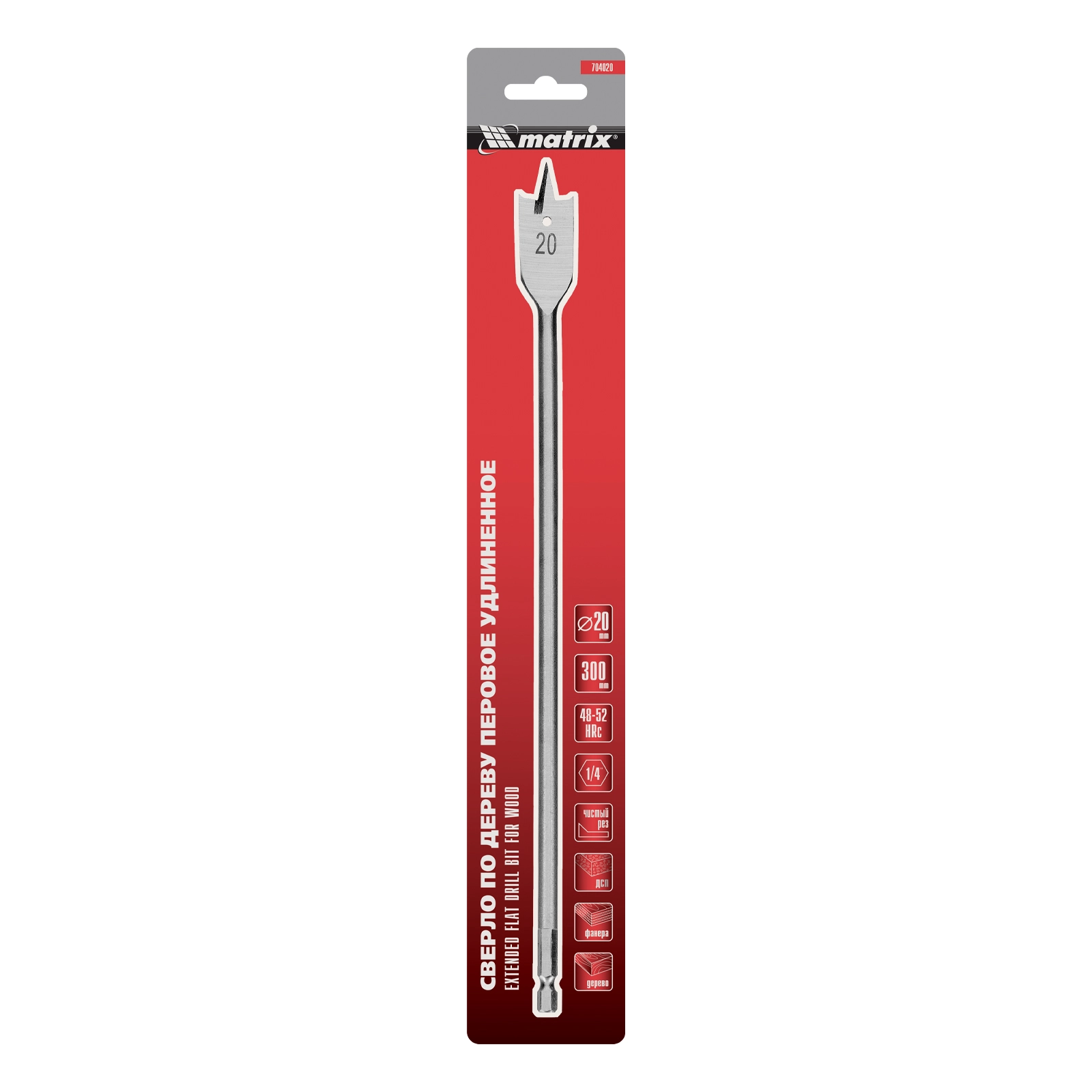 ПроизводителиСверло по дереву перовое удлиненное, 20 х 300 мм, 6-гр. хвостовик (704020) MATRIX
