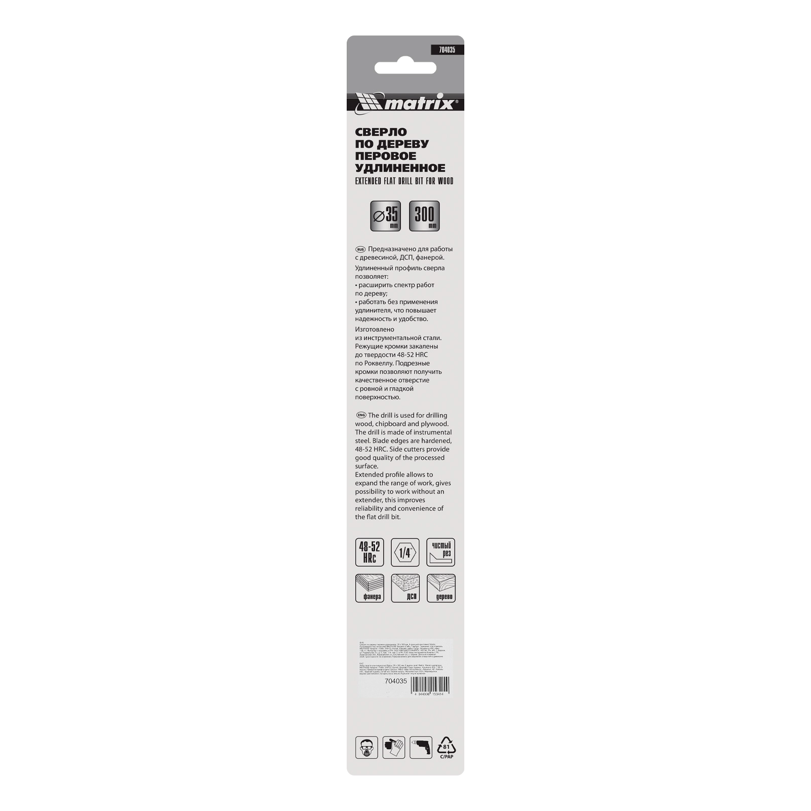 ПроизводителиСверло по дереву перовое удлиненное, 35 х 300 мм, 6-гр. хвостовик (704035) MATRIX
