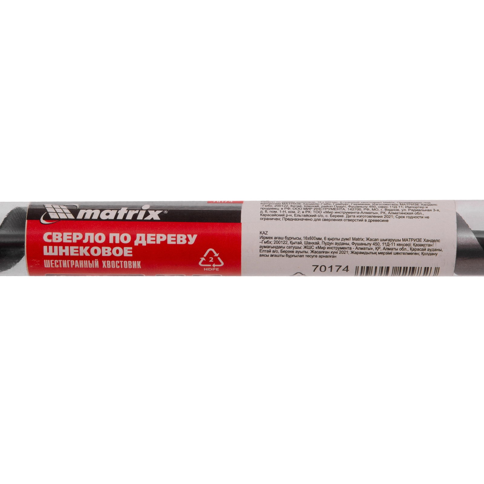 Шнековое сверло по дереву Matrix 70174, размер 16 х 600 мм, с 6-гранным хвостовиком, позволяет осуществлять сверление отверстий на большую глубину.