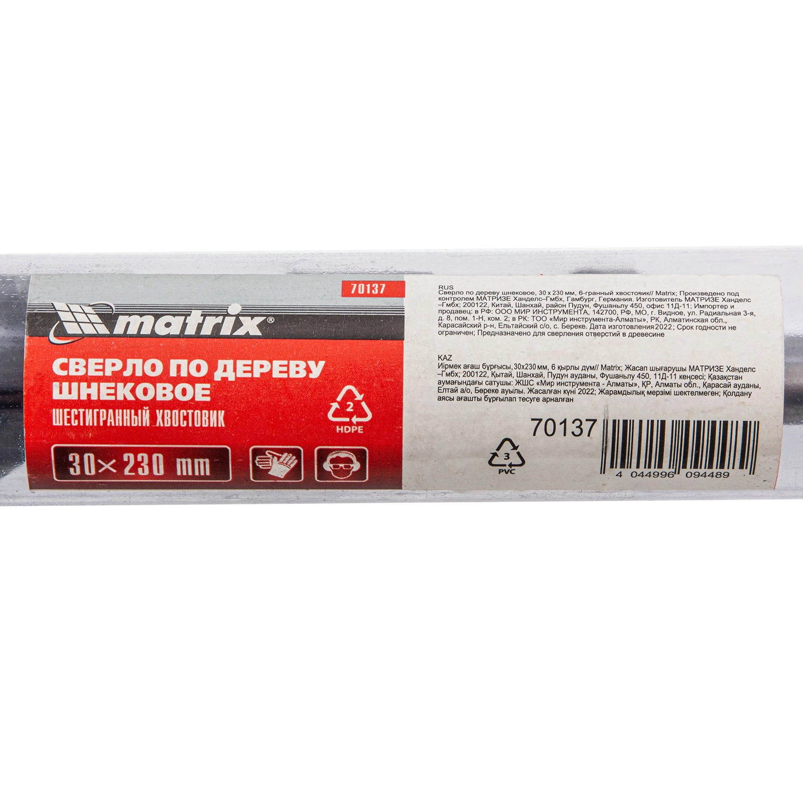 ПроизводителиСверло по дереву шнековое, 30 х 230 мм, 6-гр. хвостовик (70137) MATRIX
