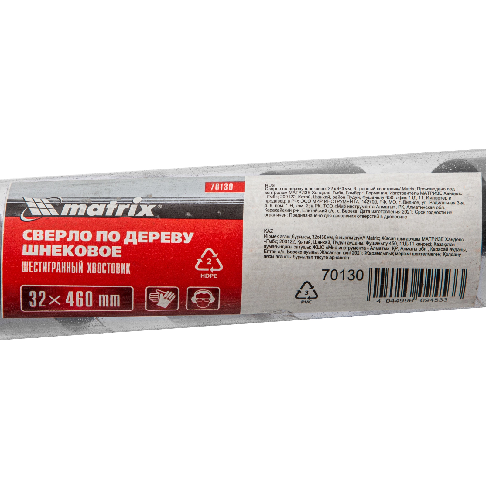 Шнековое сверло по дереву Matrix 70130, размер 32 х 460 мм, с 6-гранным хвостовиком, позволяет осуществлять сверление отверстий на большую глубину.