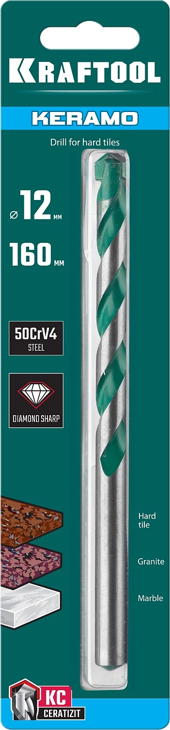 ПроизводителиСверло по керамограниту с твердосплавной пластиной 12 х 160 мм KERAMO (29175-160-12) KRAFTOOL