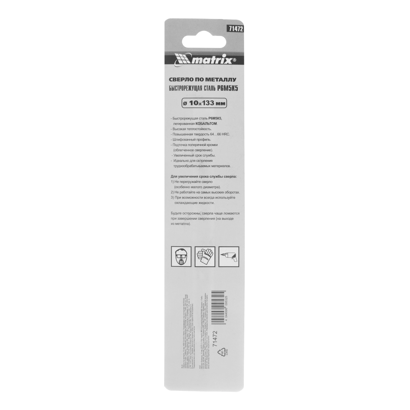 Сверло Matrix 71472 диаметром 10 мм, из стали HSS Co-5%, имеет угол заточки 135 градусов, поэтому используется для сверления легированных и цветных металлов.