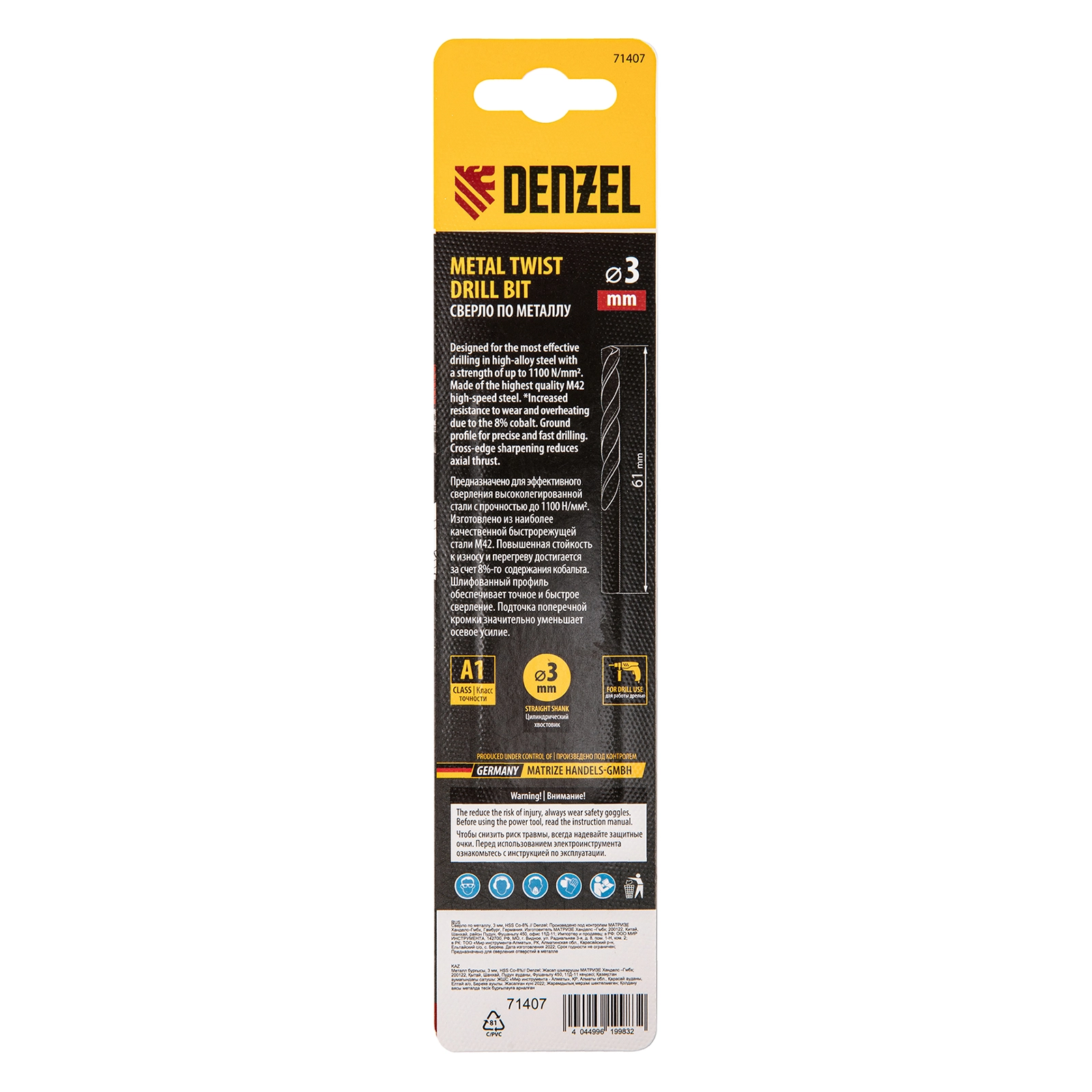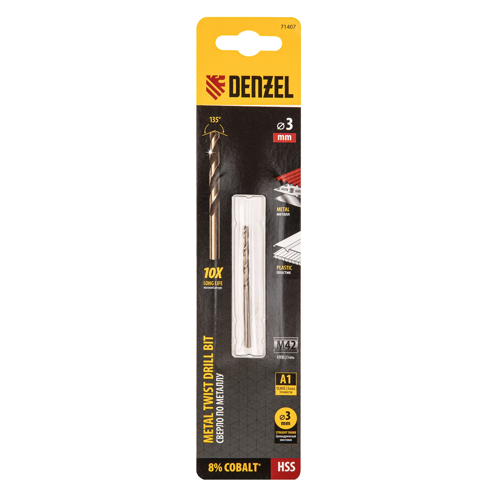 ПроизводителиСверло по металлу 3 мм, HSS Co-8% (71407) DENZEL