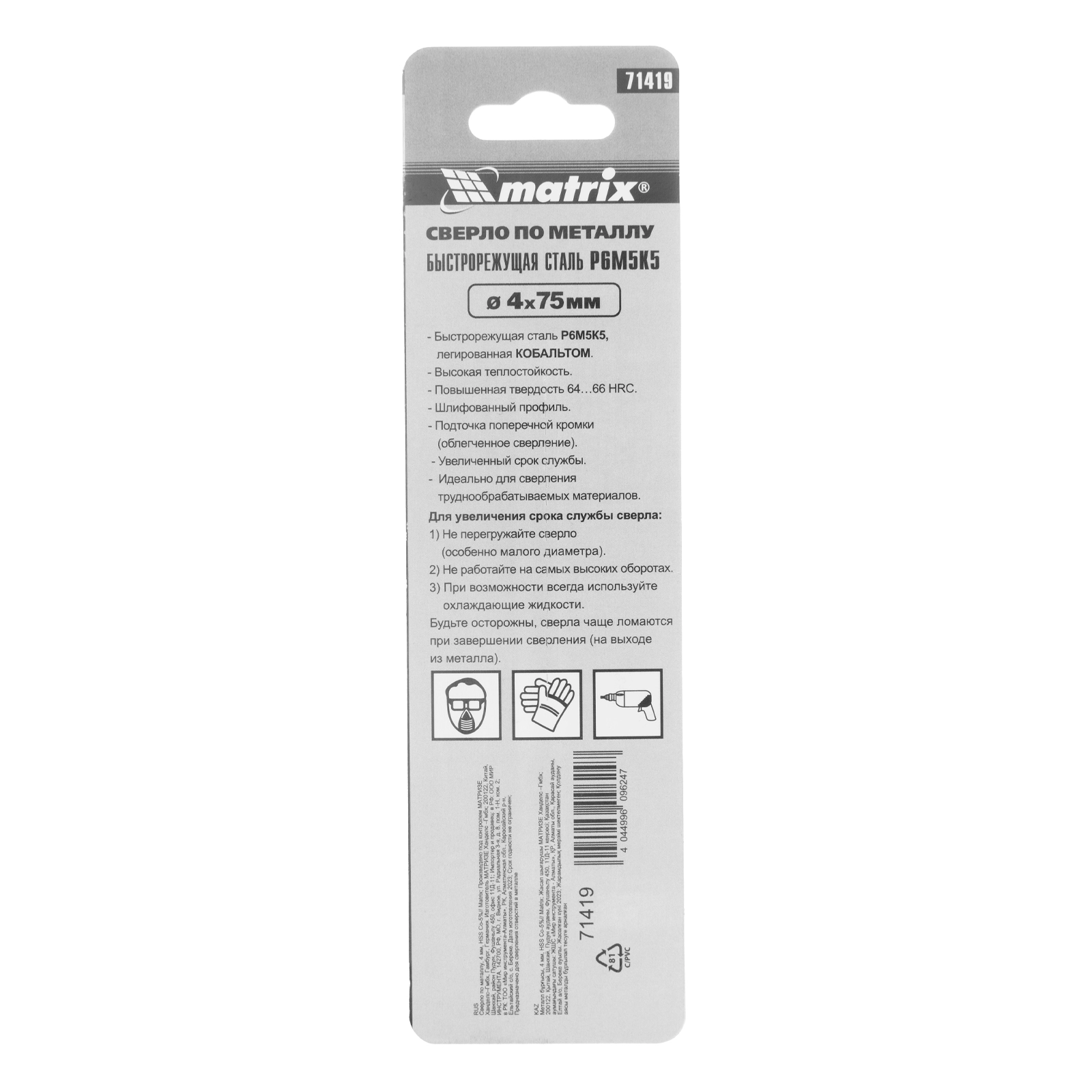 Сверло Matrix 71419 диаметром 4 мм, из стали HSS Co-5%, имеет угол заточки 135 градусов, поэтому используется для сверления легированных и цветных металлов.