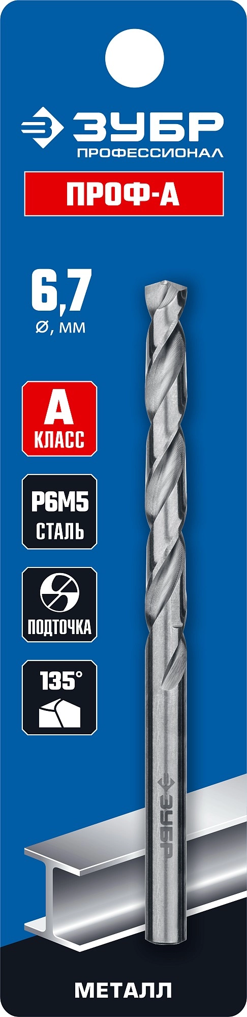 ПроизводителиСверло по металлу, 6.7х101мм, сталь Р6М5, класс А,ПРОФ-А, Профессионал (29625-6.7) ЗУБР