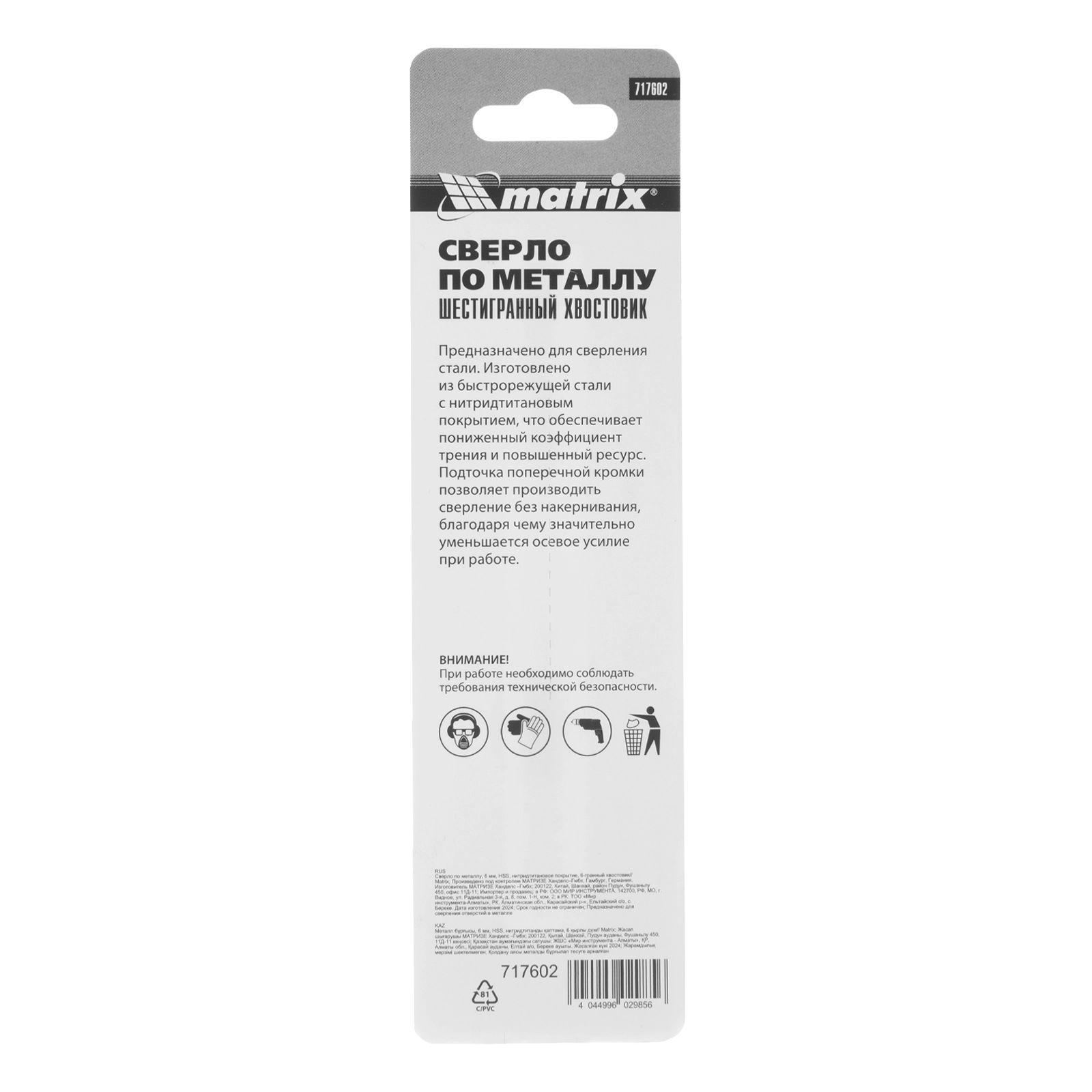 Сверло по металлу Matrix 717602 диаметром 6 мм, из стали HSS, с нитридтитановым покрытием и 6-гранным хвостовиком, устанавливается на дрели в качестве режущего элемента.