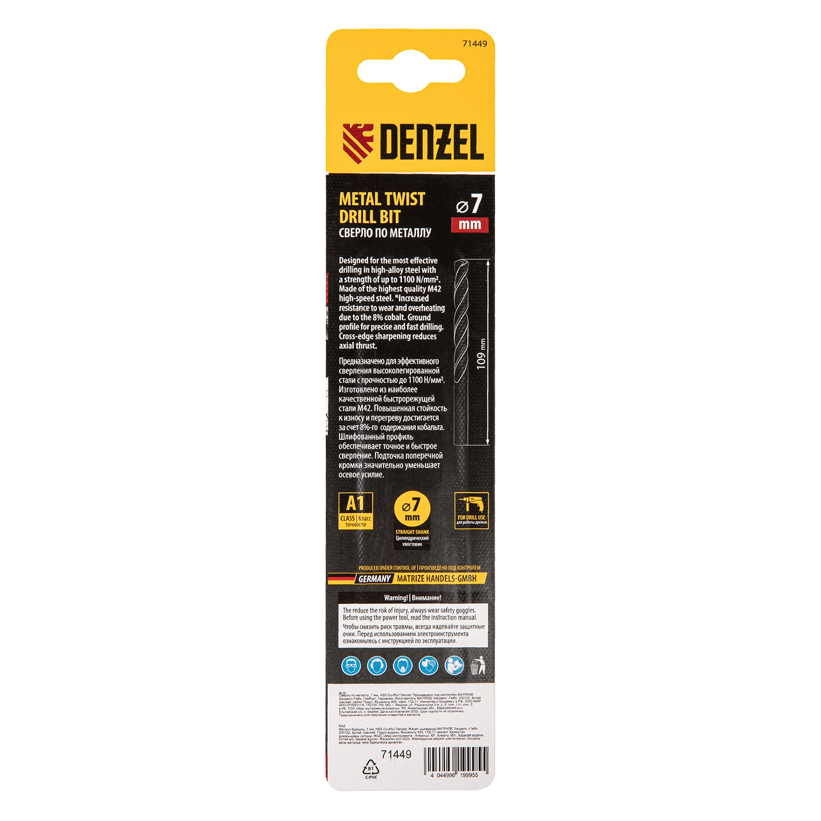 Кобальтовое сверло по металлу Denzel 71449 позволяет получать отверстия высокой точности в нержавеющей стали, цветных металлах, легированных и нелегированных сталях с прочностью до 1100 Н/мм2 и жестком пластике.