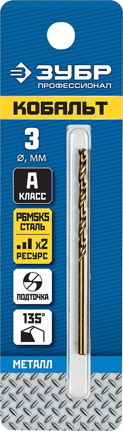 ПроизводителиСверло по металлу ц/х 3.0х33х79 мм, HSS-Co, класс A "КОБАЛЬТ""ПРОФЕССИОНАЛ" (29626-3) ЗУБР