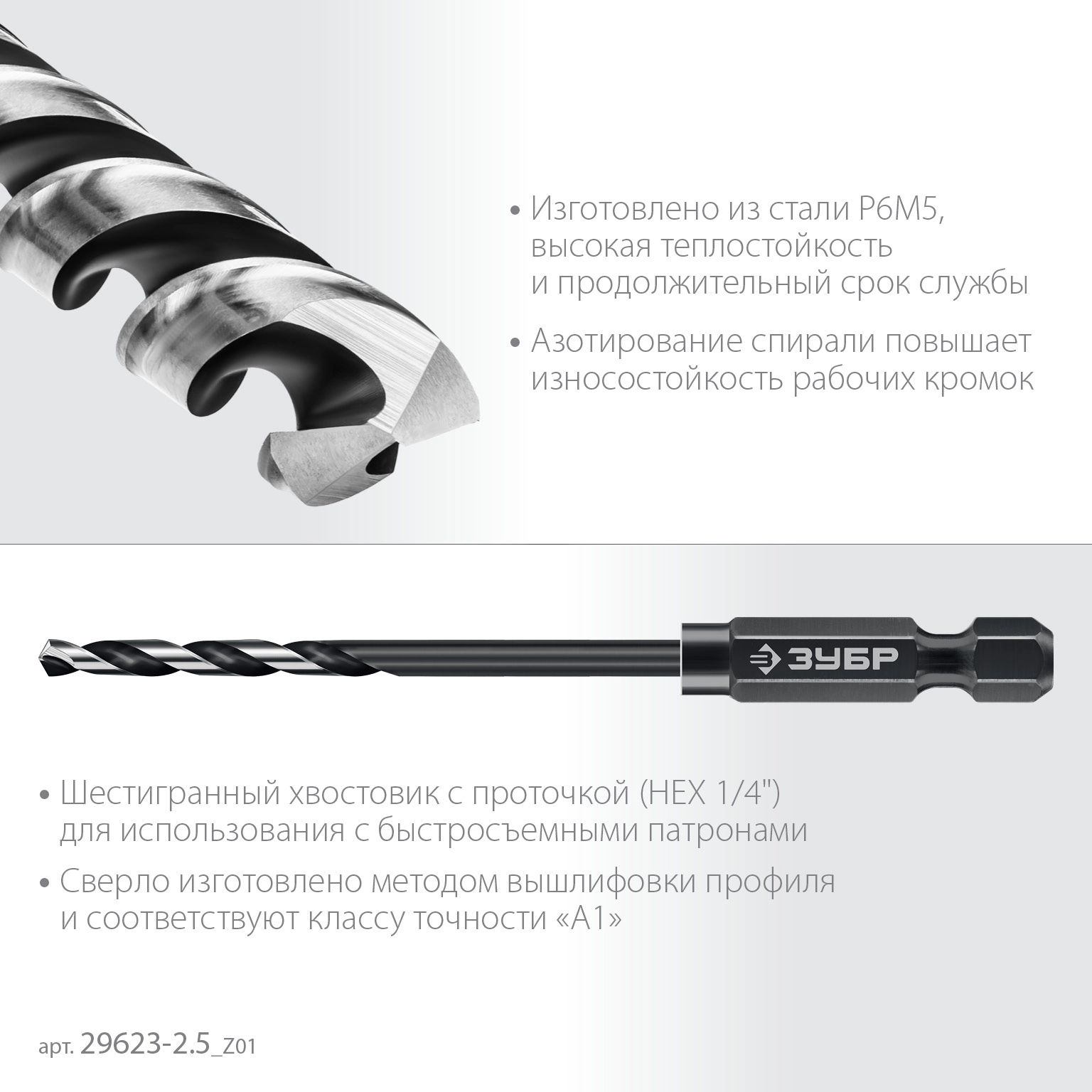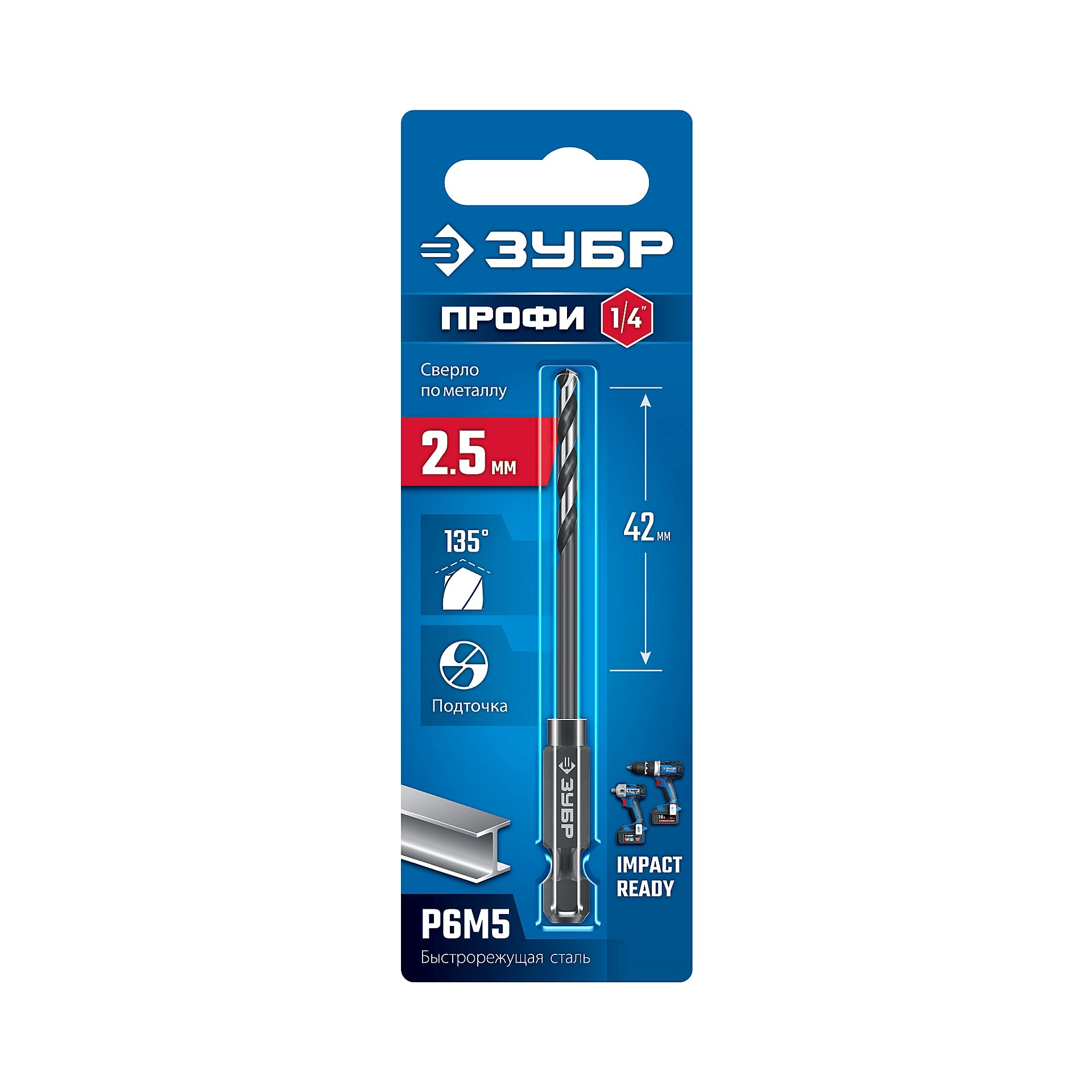 ПроизводителиСверло по металлу ц/х 2.5х30х77 мм, HSS, хв. HEX 1/4", класс A1 "IMPACT READY" (29623-2.5_z01) ЗУБР