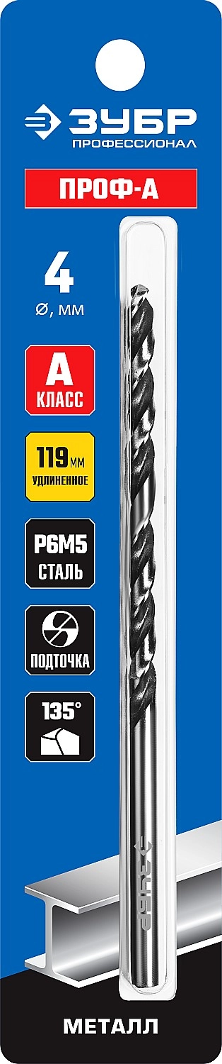 ПроизводителиСверло по металлу ц/х 4.0х78х119 мм, удл. HSS, класс А1 "ПРОФ-А" (29624-4) ЗУБР