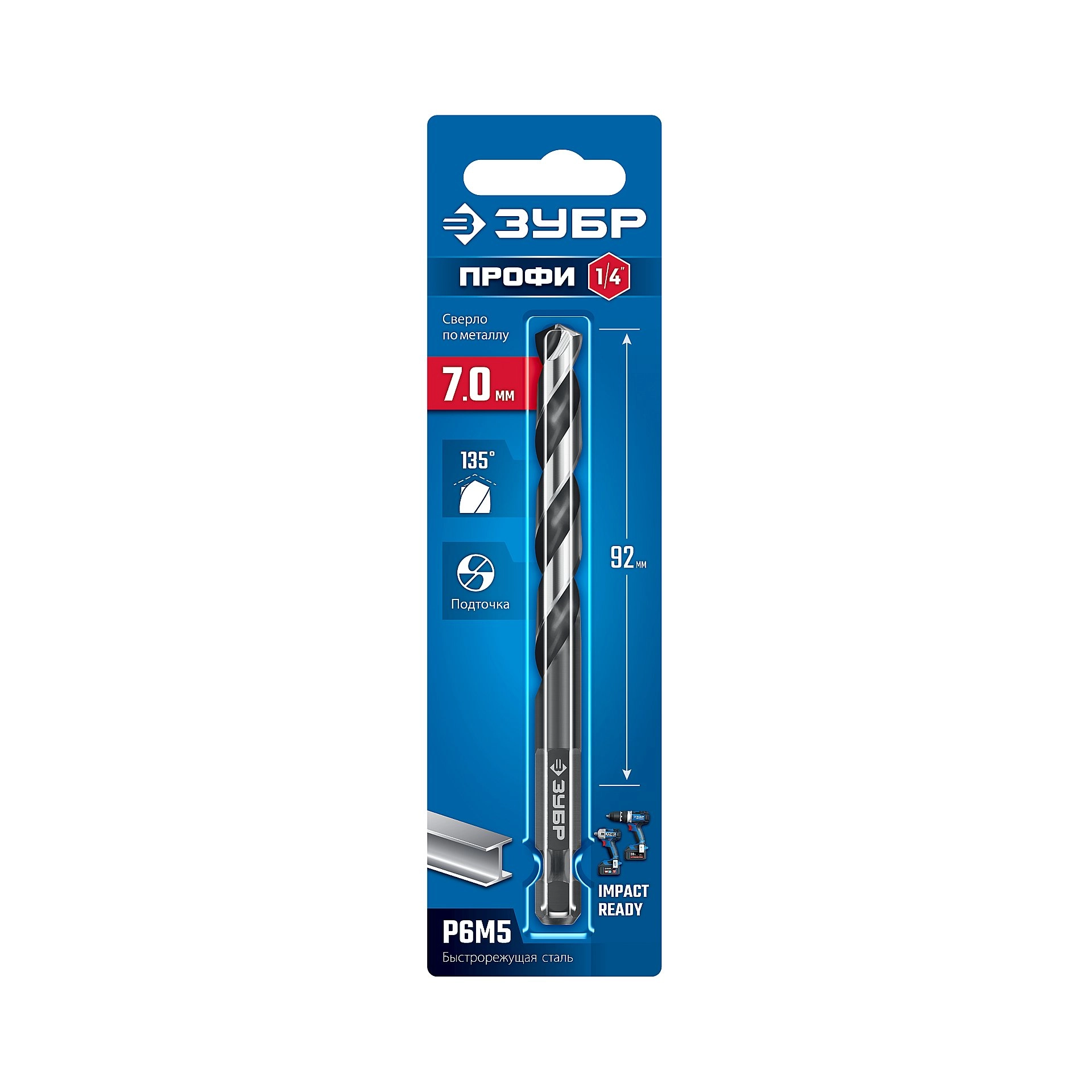 ПроизводителиСверло по металлу ц/х 7.0х69х109 мм, HSS, хв. HEX 1/4", класс A1 "IMPACT READY" (29623-7_z01) ЗУБР