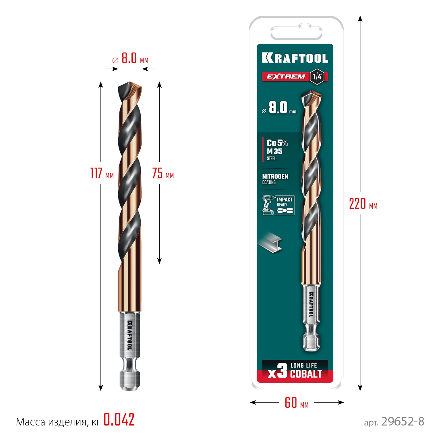 ПроизводителиСверло по металлу ц/х 8.0х75х117 мм, HSS, хв. HEX 1/4", класс A1 "IMPACT READY" (29652-8) KRAFTOOL